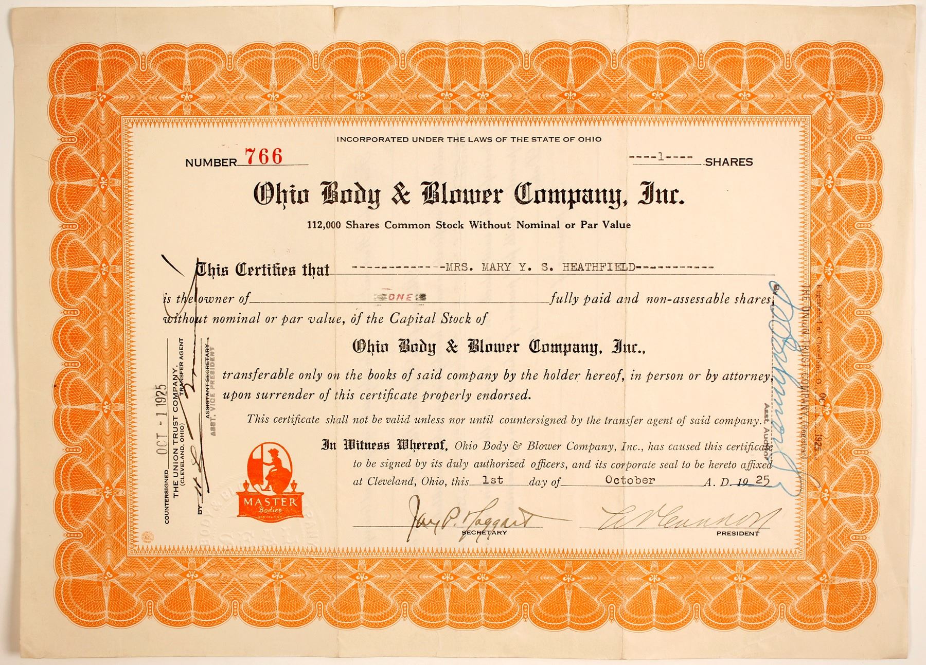 1 share of Ohio Body & Blower Co., Inc cert # 766 issued to Mrs. Mary Y. S. Heathfield. Signed, countersigned and registered on Oct 1, 1925. Inc OH. Signed Jay P. Taggard, secy. Raised company seal, orange border. Nov. 11, 1919 Ohio Body & Blower Company was organized to do business as Ohio Blower Co., being incorp. in Ohio on Nov. 6, 1901. Principle products listed as automobile bodies, sheet-metal buildings, sheet iron ventilators, cast iron exhaust heads, steam traps, steamship ventilators, feed water heaters and valves. Ken Prag Collection
