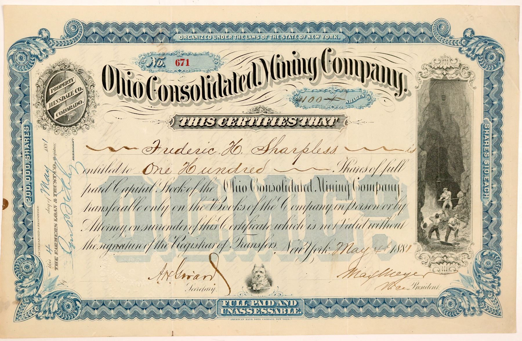 Property Hinsdale Co., Colorado (printed at upper left). Inc. in New York. No. 671, issued for 100 shares to Frederic H. Sharpless on May 4th, 1881 in New York. Signed by vice-president Meyer and the secretary. Not cancelled. Blue border, black print. Mining hoisting vignette on the right. "O.C.M.Co." printed in blue in the background. Printed by ABN. Pinholes, folds, light wear. 7 x 11.25" Not listed in C&L. A February 11th, 1881 Lake City Mining Register article mentions that the company has been formed and purchased the Nellie, Ella, and Sunrise Lodes on Bear Creek. According to an article in E&MJ Vol. 30 (1880), the company stuck a vein on the McDonald claim, located near Rose's Cabin, 16 miles from Lake City, Hinsdale County. Assays are yielding 160 ounces of silver per ton. Ken Prag Collection