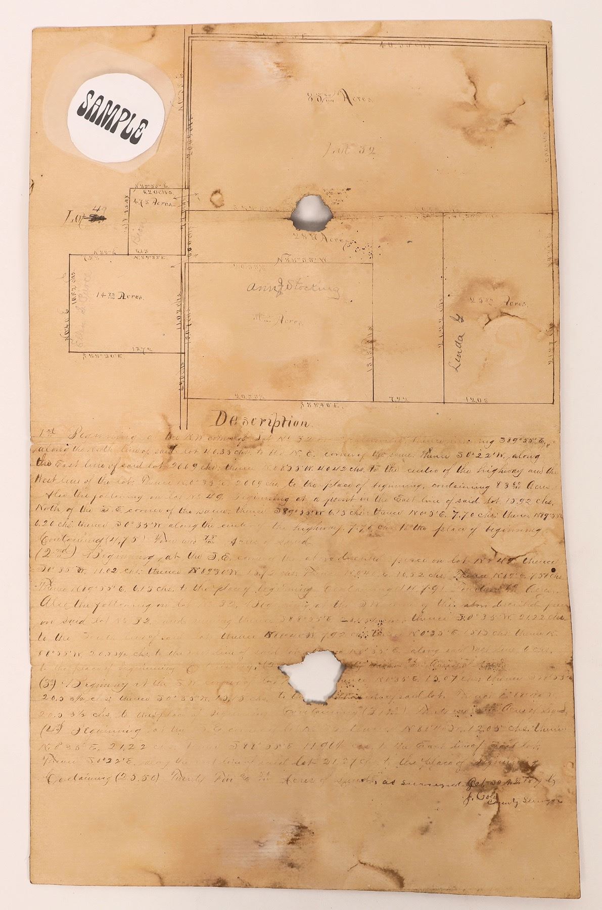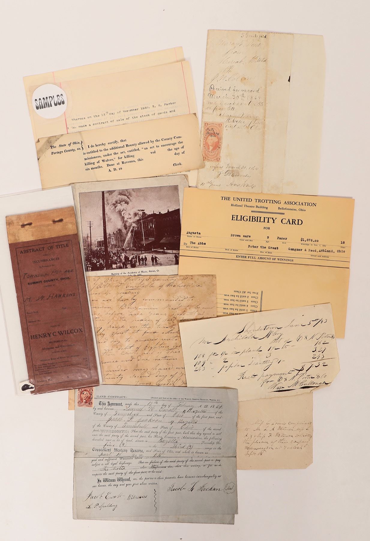 A dozen Ohio documents, c1823-1932. Includes several land deeds; Portage Co. notices awarding bounty for killing wolves c18XX (2); wedding invitation Charlestown or Ravenna, OH c1840 or '50; survey map Portage Co., c1879; Portage Co. Summons c1823; photograph of burning of the Academy of Music, Akron, OH, c1897; & 1932 horse race betting card, Bellefontaine, OH, c1932. Please see photo(s) for more information.[ Ohio