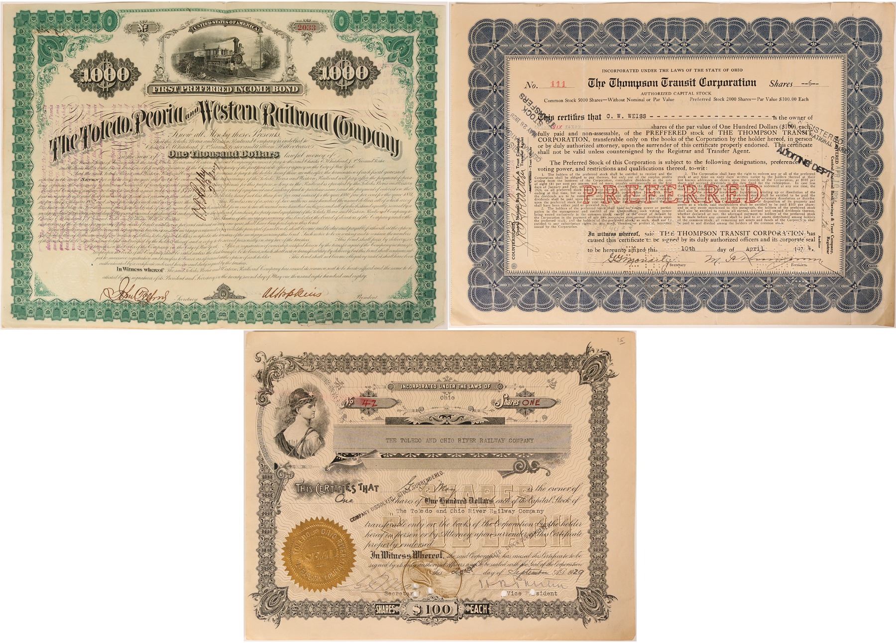 3 certificates. 1. The Thompson Transit Corp. incorp. Ohio. #111, I/C, 6 shares @$100 par issued April 10, 1924. Blue, embossed seal, no vignette, PREFERRED in red underprint. Unknown printer.