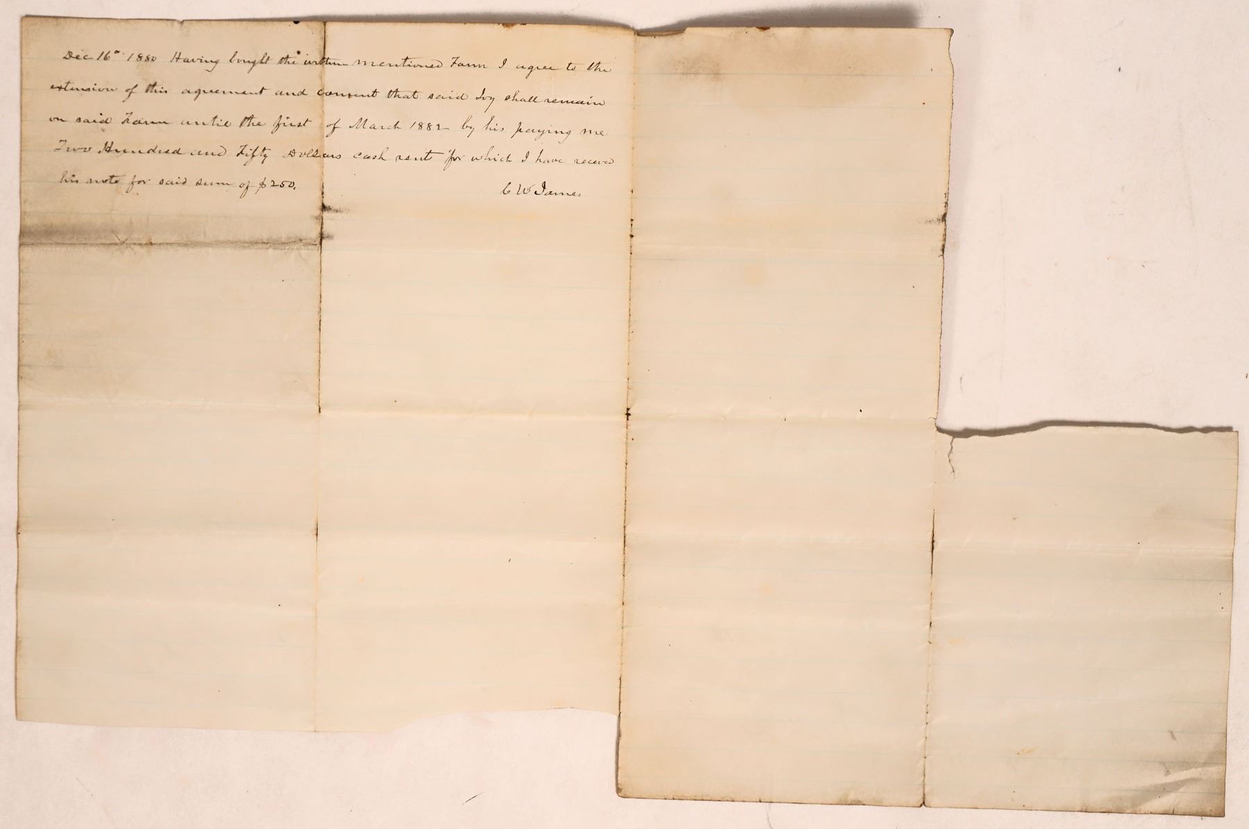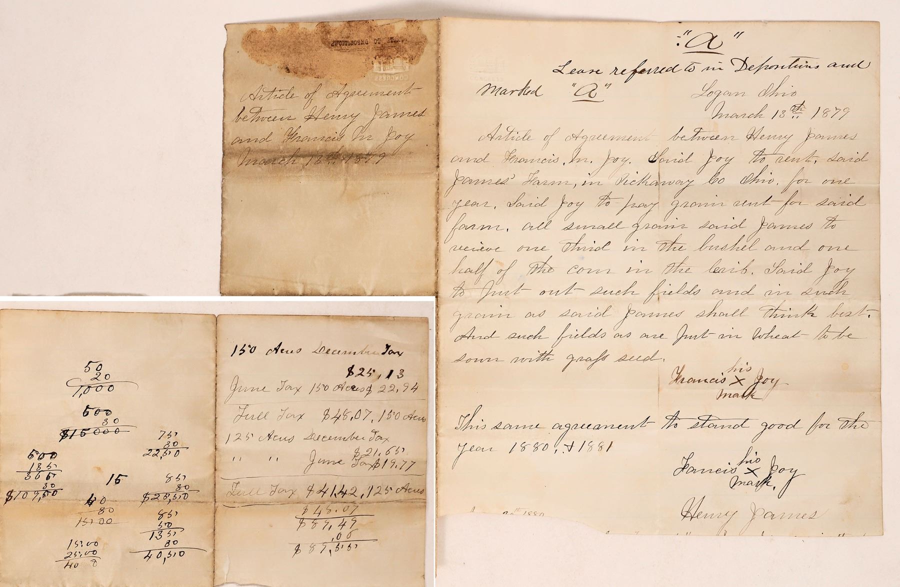 A signed agreement to lease a farm from 1880 to 1881 in Logan, OH. Farm owned by Henry James, who allowed wheat fields to be planted with grape seed. Signed "X." Please see photo(s) for more details.[ Logan Ohio