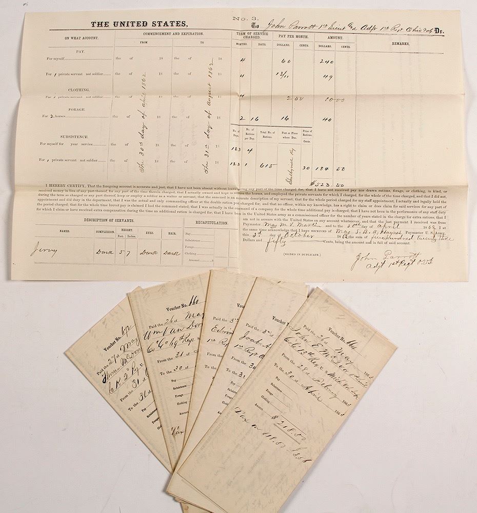 Lot of 6 total. 1) Four from Ohio, 1862-1863: 1st. Lt. John Parrott; 1st Lt. William Van Dorn; Col. Edwin A. Parrott; and Major J.A. Stafford. 2) One from Michigan: 1st. Lt. John E. McLoor, Michigan Vol. Infantry, 1863. 3) One from Minnesota: 1st Lt. Thomas McDonaugh, Minnesota Vol Infantry, 1862-63. Each voucher is approx. 10 x 16.5" and includes allocations for pay and rations to the soldier and their servants, if any. Very good condition! (Prag Collection) Date: Location: Ohio HWAC# 55533