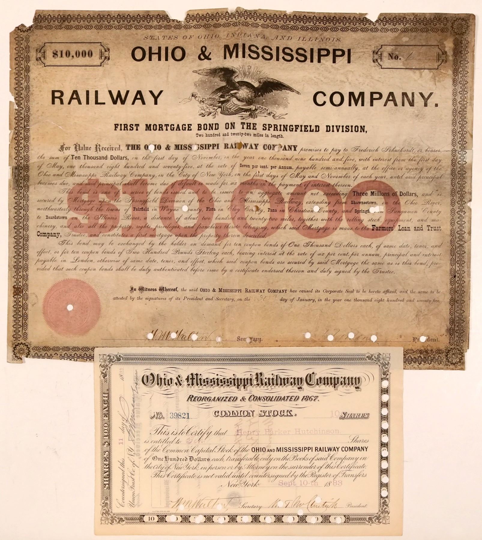 Two certificates. Consolidated 1867 states of Ohio, Indiana and Illinois. 1. #1, I/C, $10,000, 7% , 30 yr bearer bond due 1905. Issued Jan 30, 1875 to Frederick Schuchardt president signature not readable. Black, embossed red seal w/train center. Vignette top eagle wings spread holding Union shield. "$10,000" red underprint. Cancel punch holes, has some discoloration, small tears on edges. Printer not identified. 2. #39821, I/C, 10 shares @ $100 par issued Sept 10, 1883 (stamped), signature cancel punched. Black, no vignette Old Script title. Geo. F. Nesbitt & Co. printer. EF.