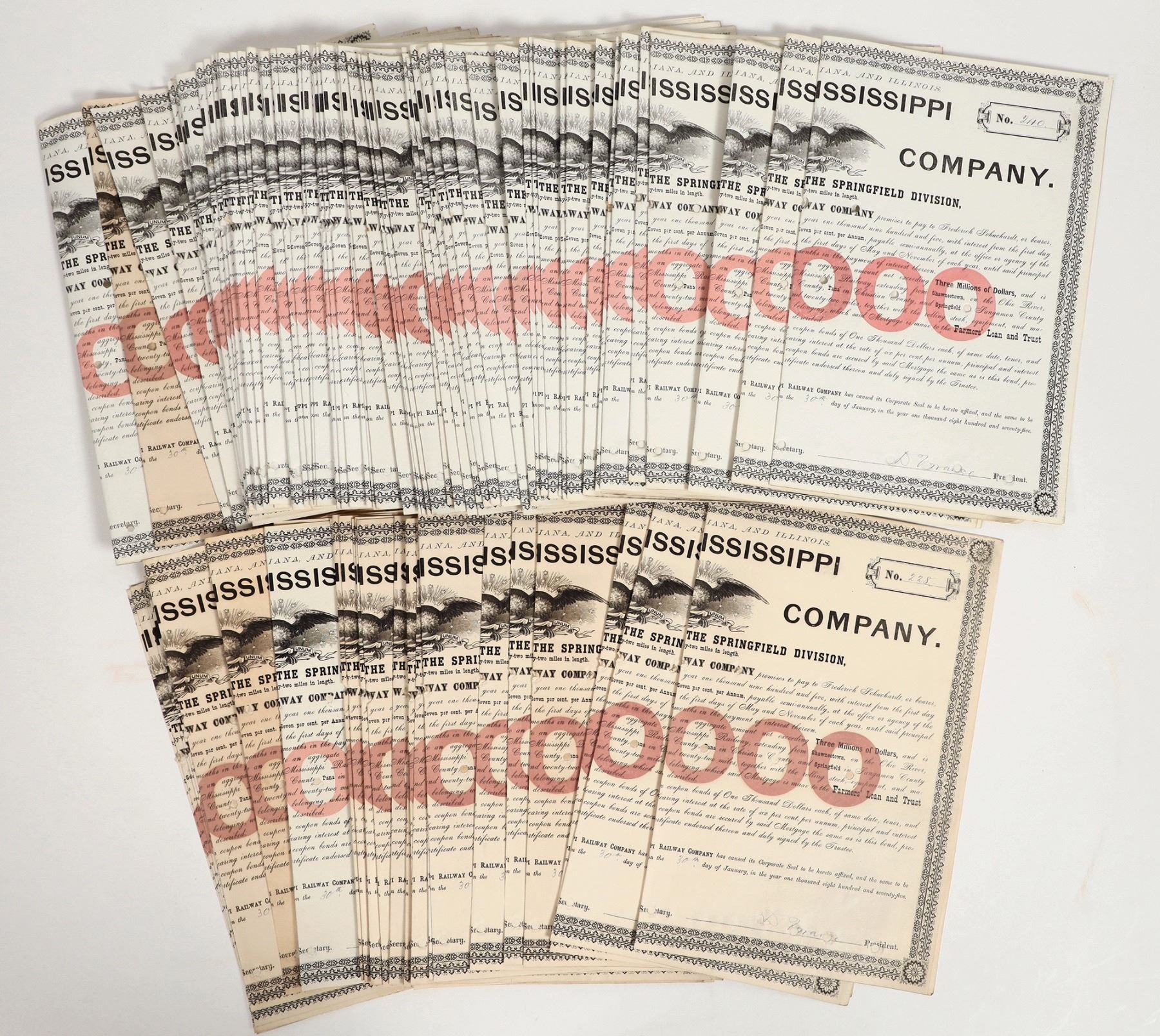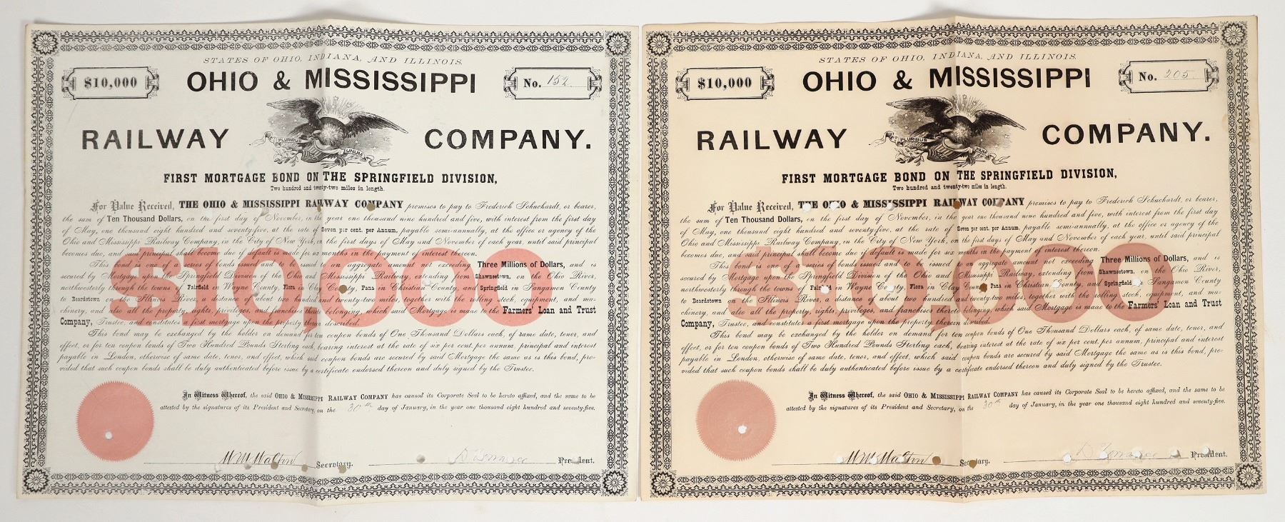 $10,000 first mortgage bonds (90+) on the Springfield Division of the Ohio & Mississippi Railway Company. Black ink, eagle vignette. 16 x 12 inches.