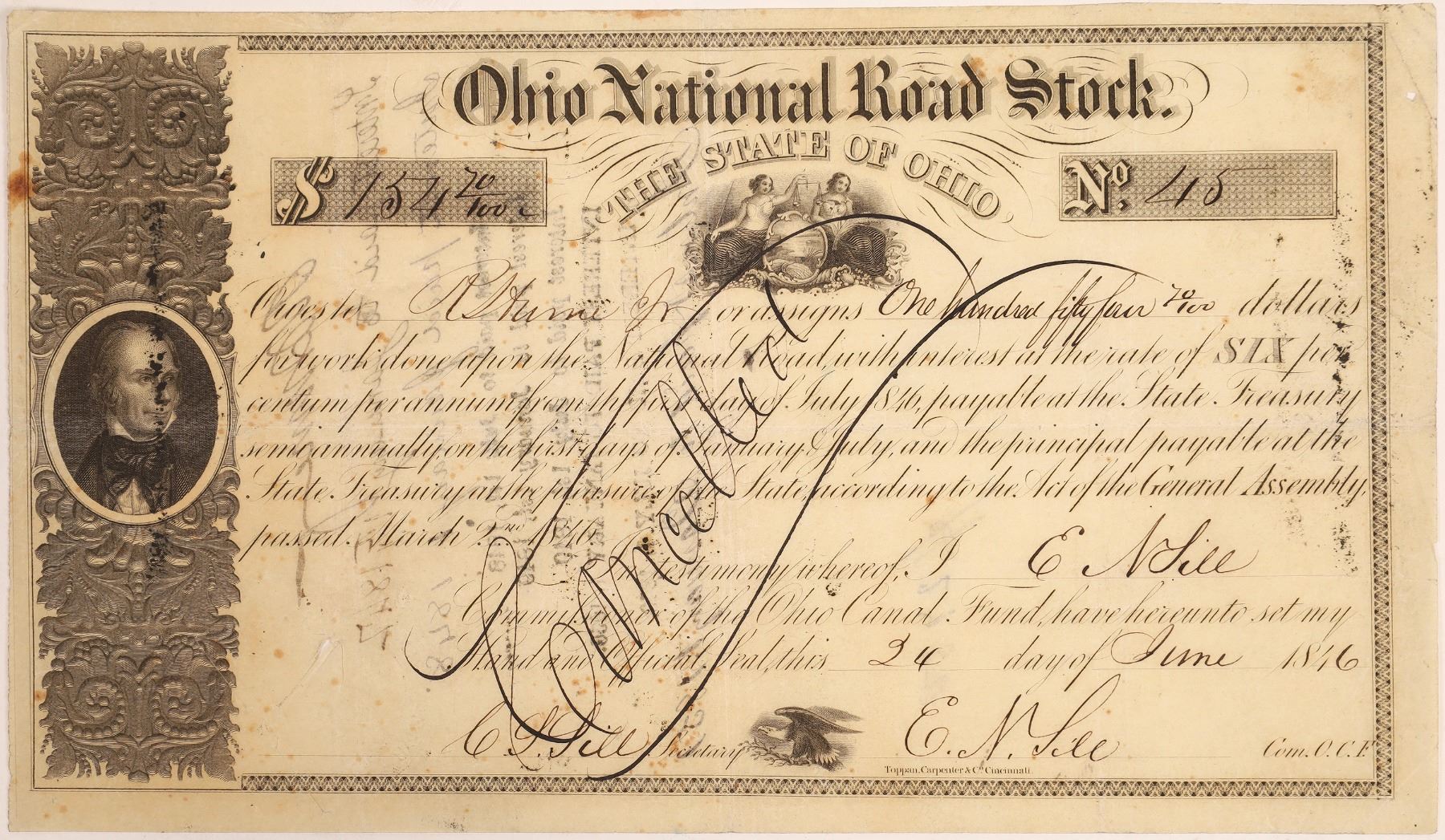 No. 45, issued for receipt of $154.70 from R. Hume Jr., at a rate of 6% per annum payable at the State Treasury. Signed by EN Sill, commissioner of the Ohio Canal Fund. Pen cancelled. Black border and print on thin paper, three vignettes (portrait of unknown man, allegorical, and eagle). Toppan, Carpenter & Co., Cincinnati. Pinholes, folds, light wear. 5 x 8.5" The National Road was the first major improved highway in the United States built by the federal government. Built between 1811 and 1837, the 620-mile road connected the Potomac and Ohio Rivers and was a main transport path to the West for thousands of settlers.