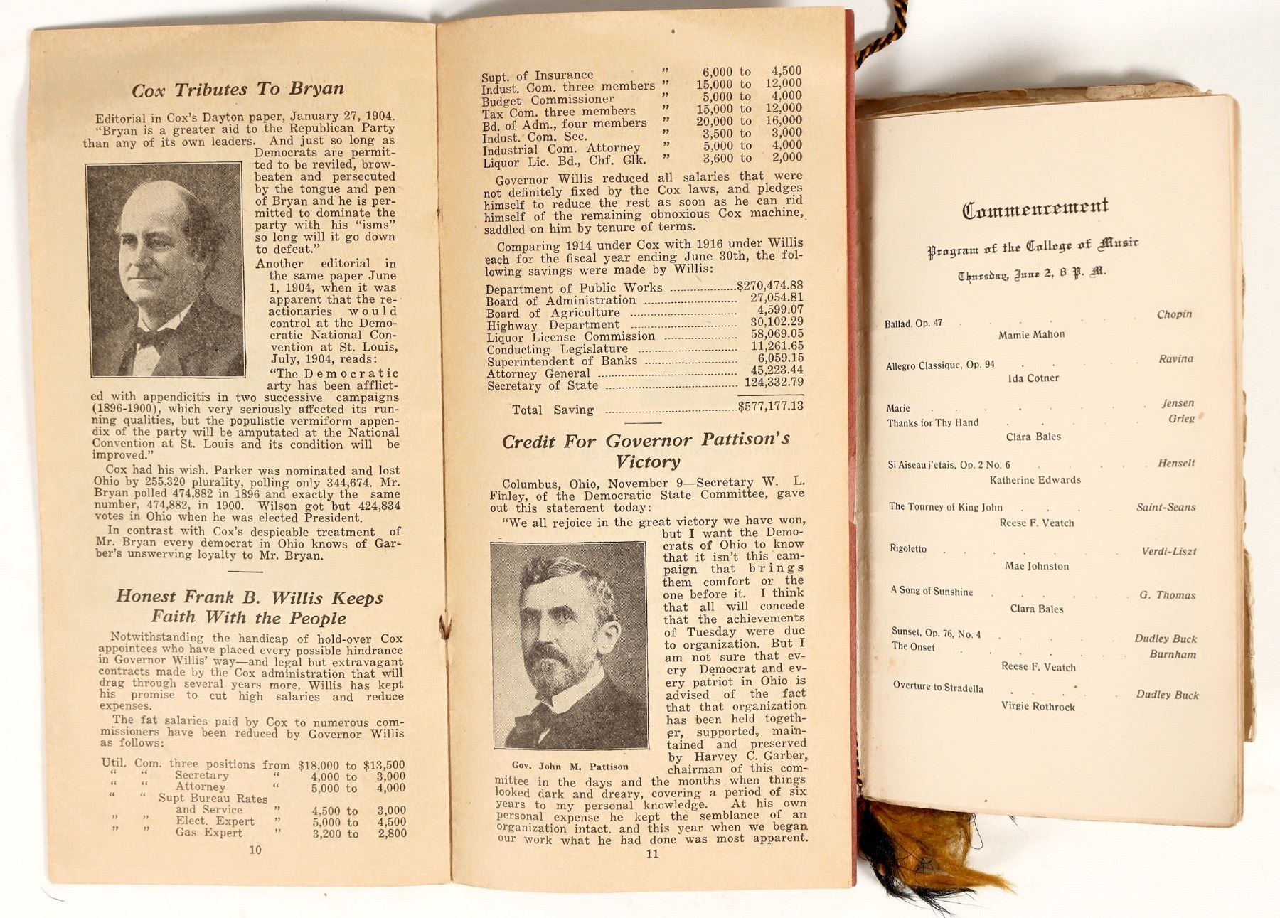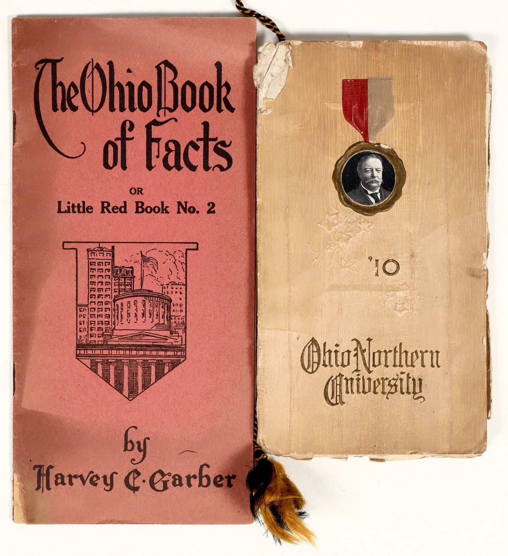 This lot comprises a pair of early 20th-century Ohio collectibles, including a 1910 Ohio Northern University booklet featuring the faculty and graduating class plans to "Address by His Excellency William Howard Taft." Additionally, the booklet is ten pages long and includes an entire list of faculty names and student names. The second item has a 16-page count and is titled "The Ohio Book of Facts" (Little Red Book No. 2) by Harvey C. Garber, providing facts about Ohio politicians from the early 1900s. Both are in good vintage condition with minor wear, and both exemplify excellent pieces of Ohio history.
