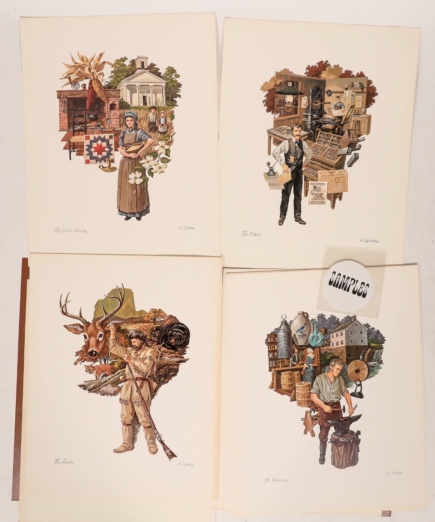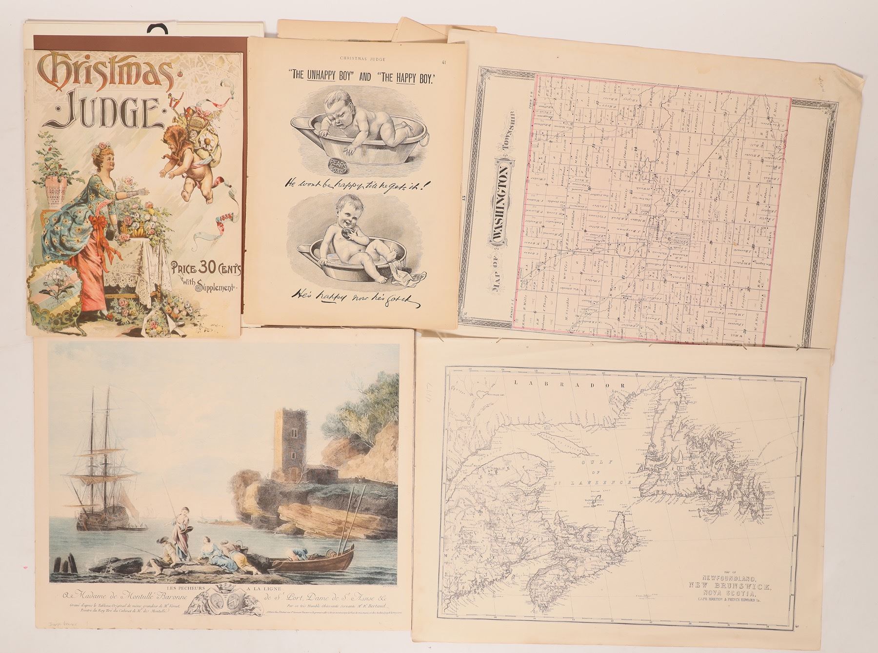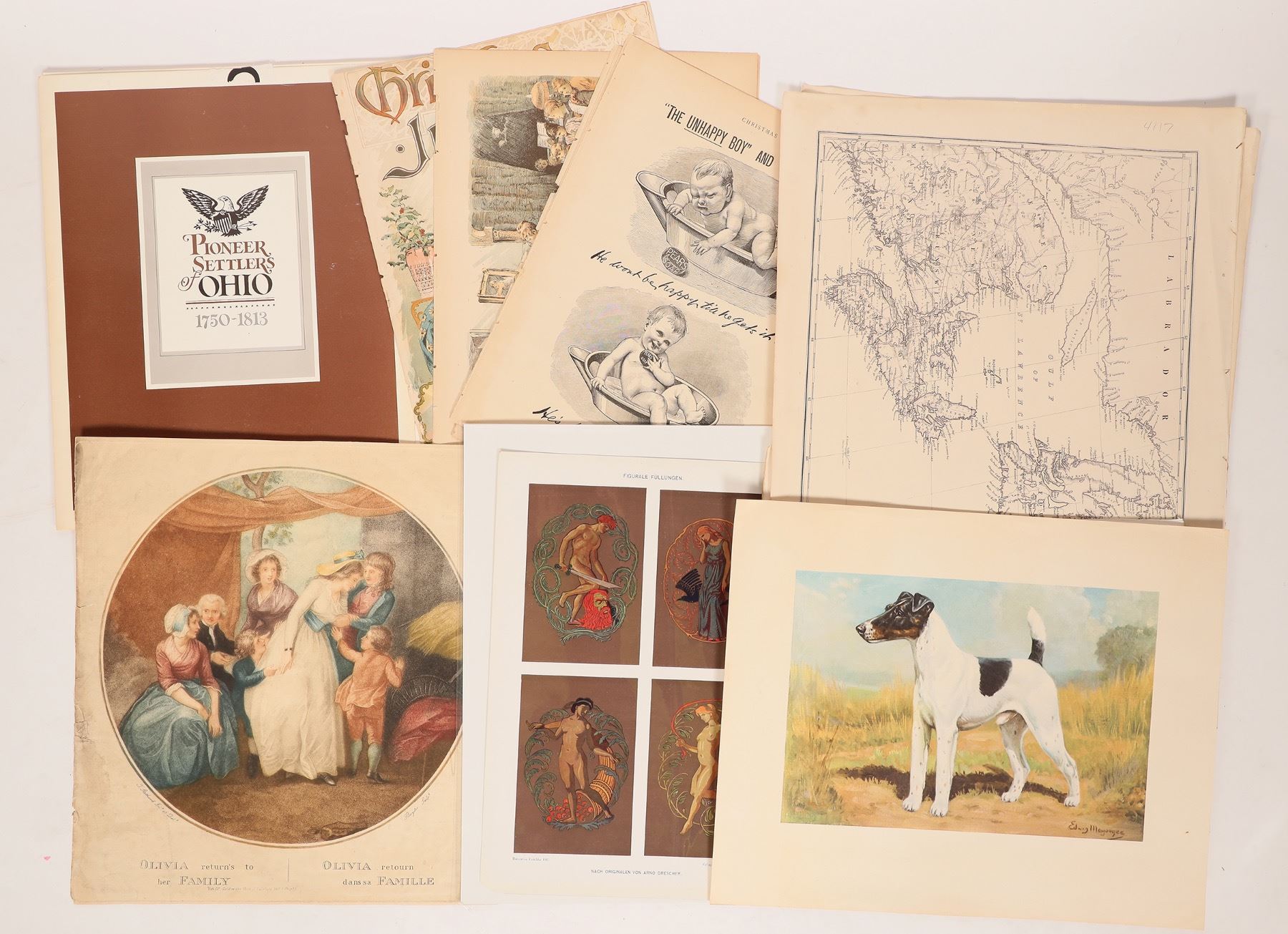 (23) Total items. Miscellaneous maps & print lot. Contains 5 prints, 1 map, 11 prints from Pioneer Settlers of Ohio, & 6 pages from a book with various prints.[ Ohio