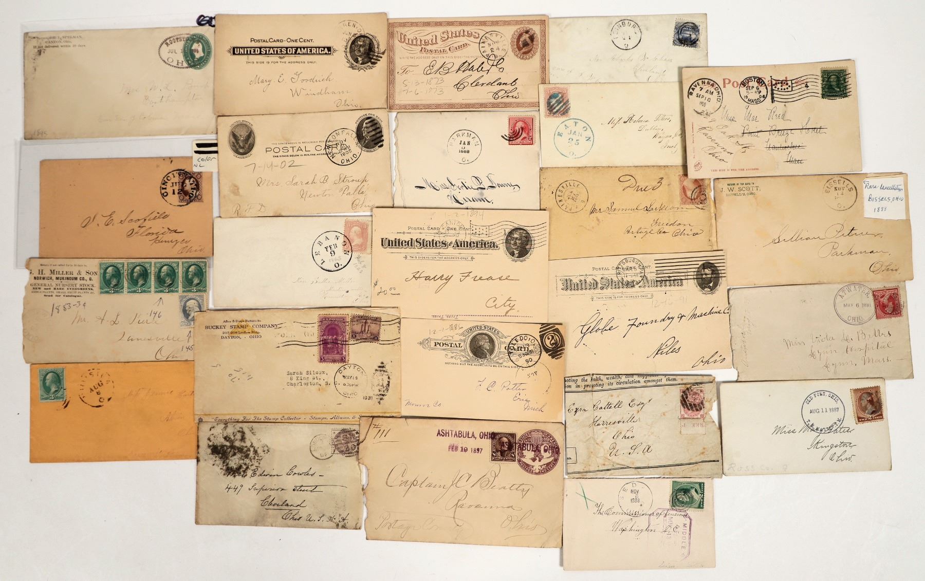 Lot of 24. Covers and postcards, some in protective covers. Various conditions. I.E; Bissels 1888, Atwater, Ohio 1891 double circle, Old Fort Ohio 1887 P.M., Painesville 1861 double circle, Cincinnati 1860's rare stamp, Rootstock Ohio 1895 spiked seal. ,