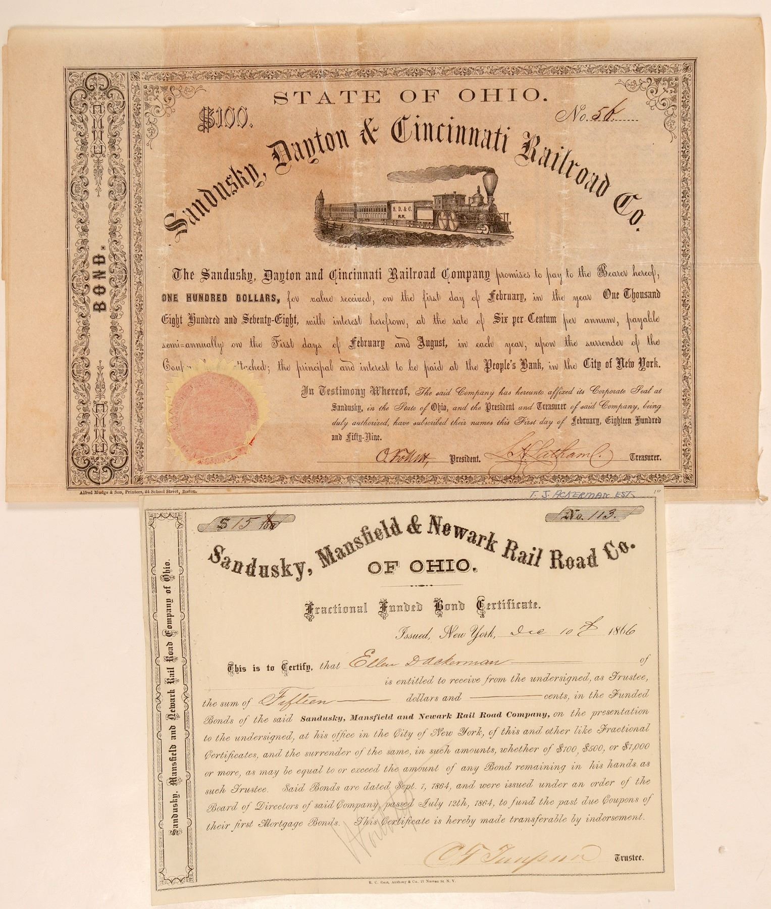 2 certificates. 1. Sandusky, Mansfield & Newark Rail Road Co. of Ohio, incorp. in 1846. #113, I/C, $15 Fractional Funded Bond Certificate issued Dec. 10, 1866. BLACK, no vignette, R.C. Root & Co. printer. VF