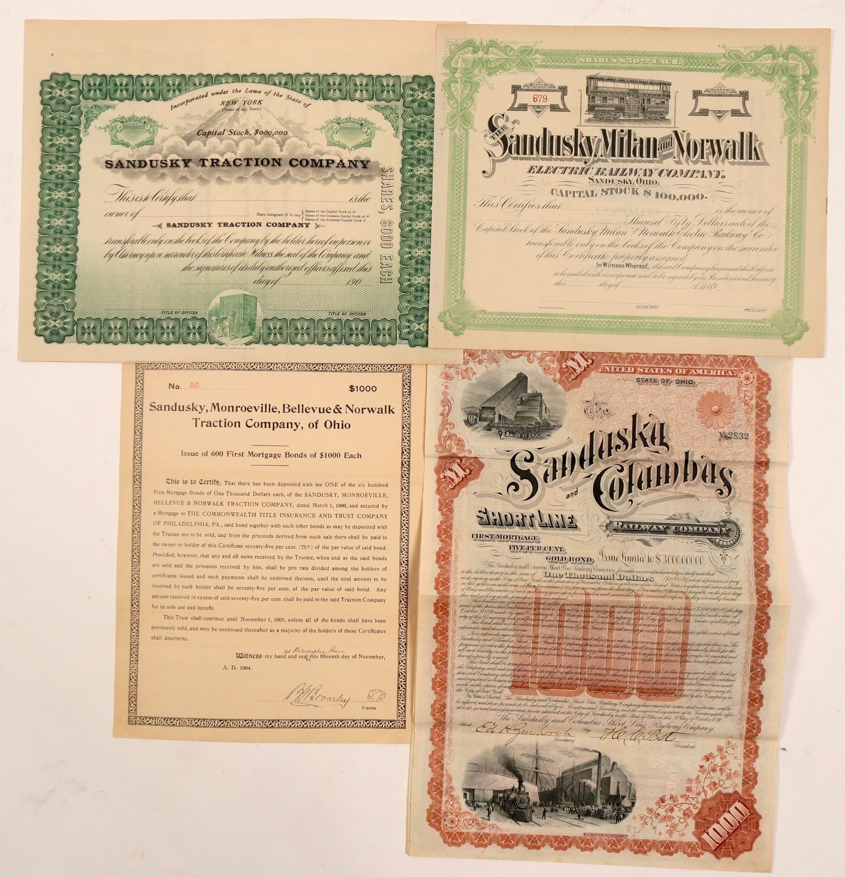 2. Sandusky, Monroeville, Bellevue & Norfolk Traction Co. of Ohio. #55, I/U, $1000 deposit on issue of 600 First Mortgage Bonds. No vignette. Issued Nov 15, 1904. Signed B. Bromley, Trustee. BLACK.