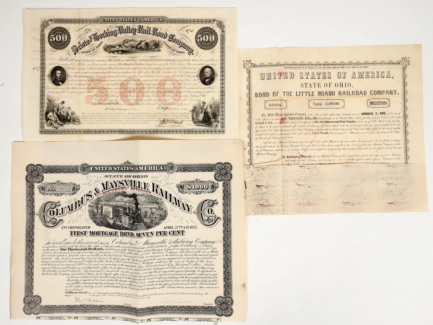 Lot of 3. 1. I/U, #274 Scioto and Hocking Valley Rail Road Co. $500, 7% bearer bond, issued 1856, due 1881.Sxx vignettes. "500" in red underprint. Coupons attached, some missing. Bald, Cousland & Co. printer. Near EF cond. 2. I/U, #59. Columbus & Maysville Railway Co. Southern Division, 7% 1st mortgage bearer bond, issued 1870, due 10 or 20 yrs. Vignette of 4-4-0 loco "White Oak, #76 " top center. Coupons attached . Strabridge & Co. printer. EF cond. 3. I/C, #374. Little Miami Railroad Co. $1000, 7% convertible bearer bond. Issued 1851, due 1861. Coupons attached. Cincinnati Gazette printer. Tri-fold creases.