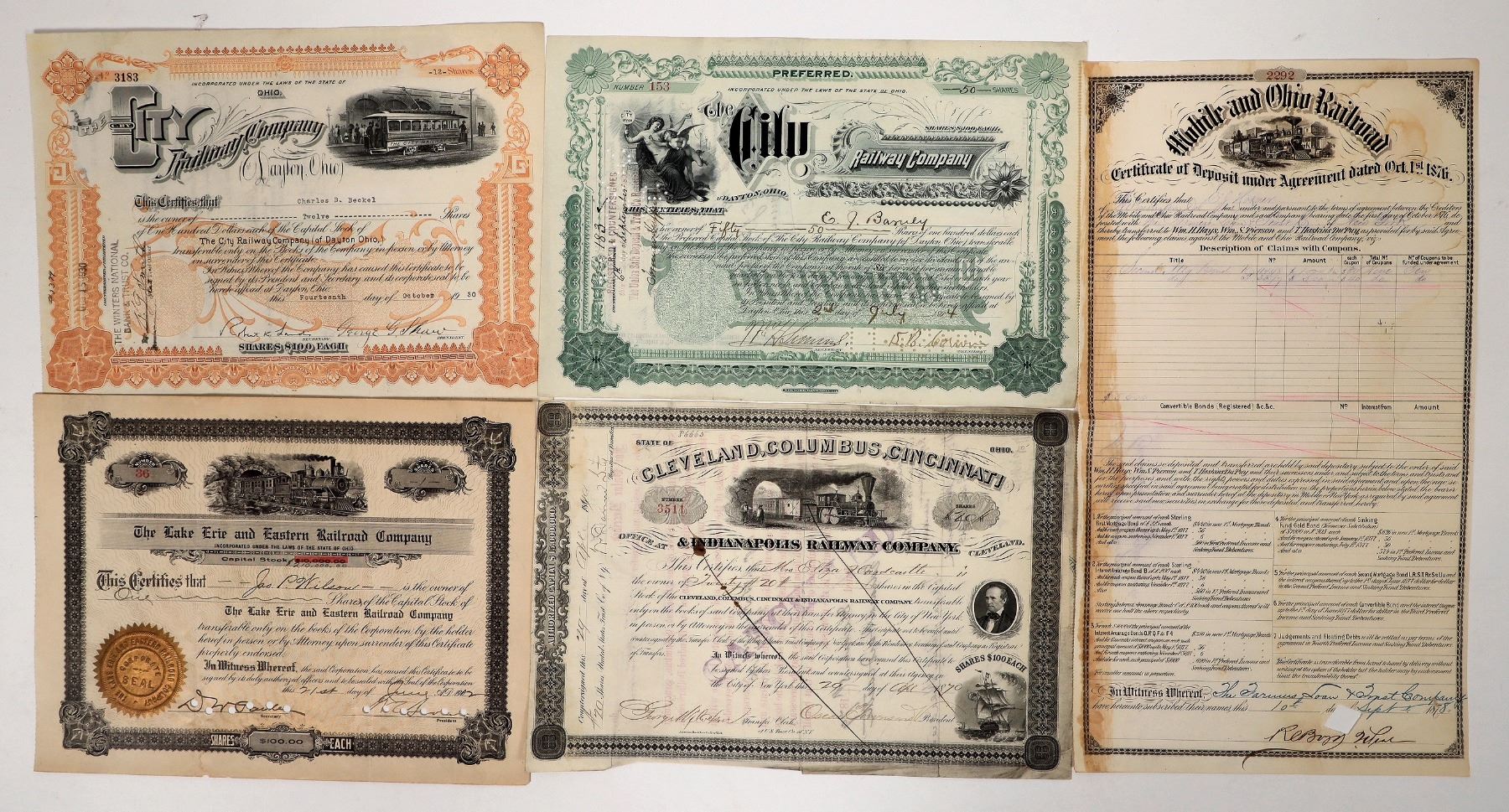 Issued-1870 Cleveland, Columbus, Cincinnati & Indianapolis-bottom creases, 1902 Lake Erie and Eastern-small bottom chips and light stain, 1904 and 1930 City RW.