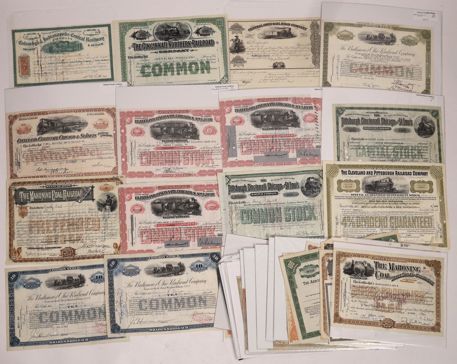 About 35 Ohio railroad stocks. 3 Mahoning Coal. 3 B&O. Little Miami Railroad 1870 -1950, some unissued. 5 Cleveland, Cincinnati, Chicago & St. Louis 1935. Columbus, Chicago and Indiana Central 1873. Central Ohio, unissued. Dayton, Xenia and Belpre 1853. And more. City: State:Ohio Date: