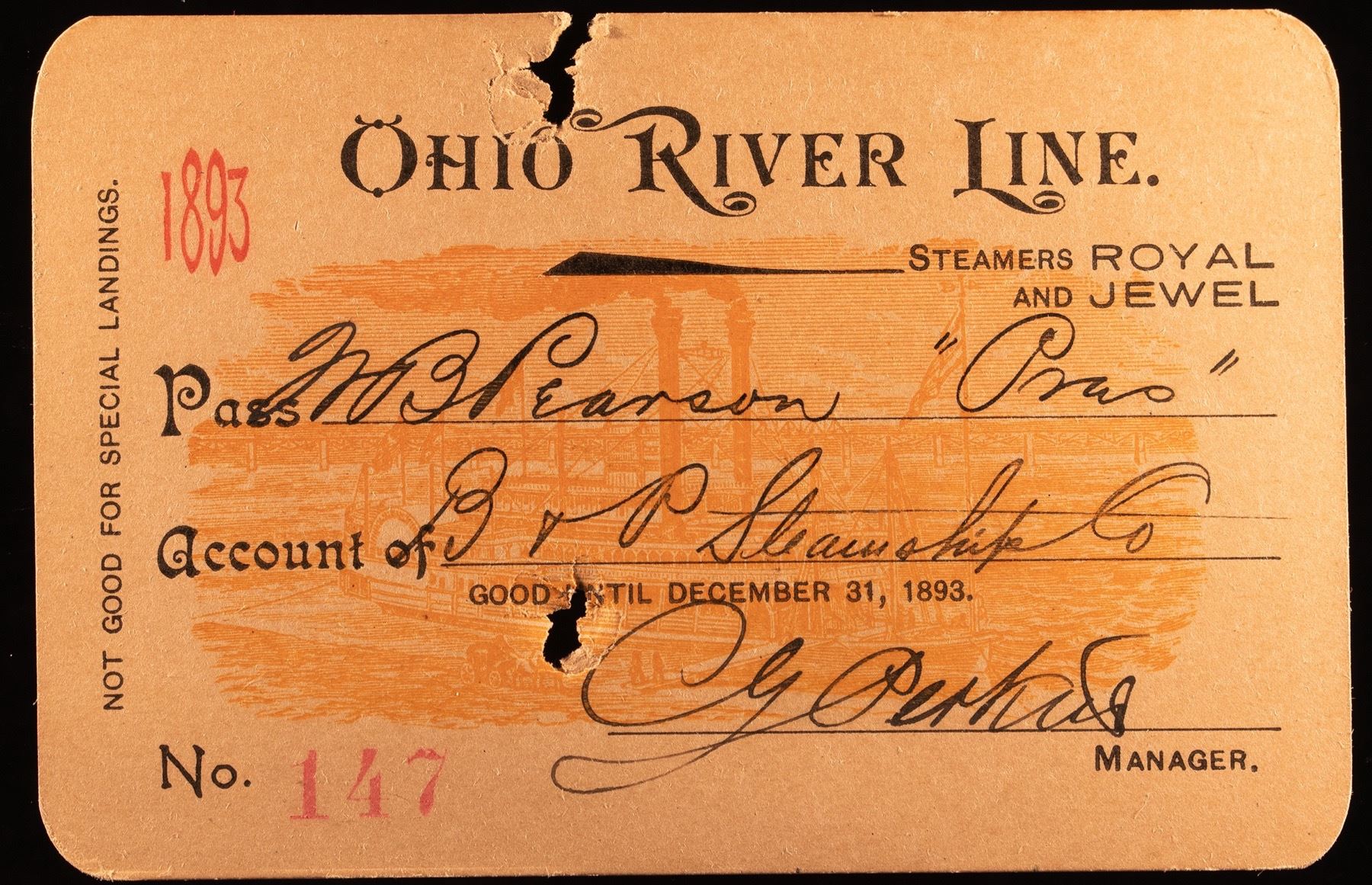 1893 pass with orange steamer vignette. Chip and small hole, adhesive thinning on reverse. Please inspect.