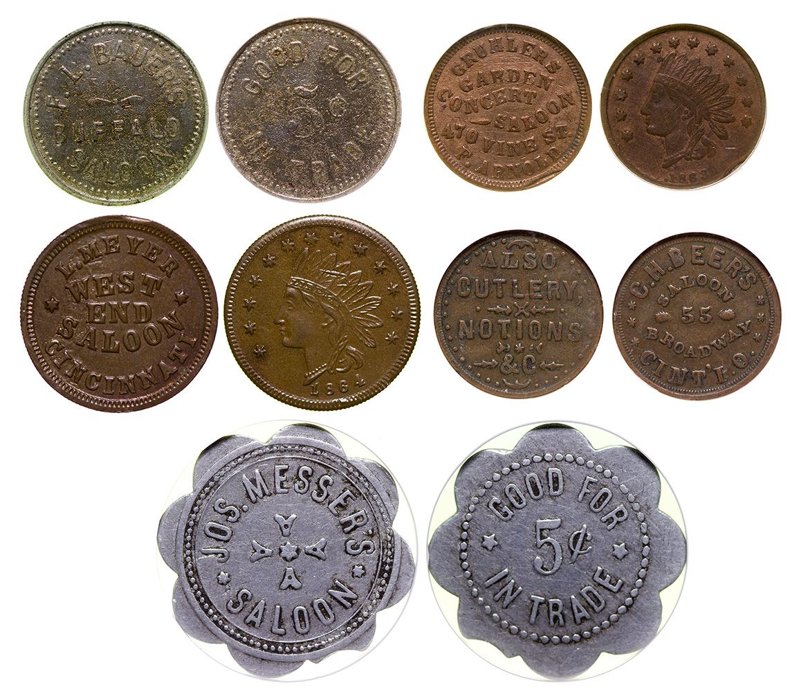 1.) WEST END SALOON - L. MEYER R9 2.) C.H. BEER'S SALOON // ALSO CUTLERY NOTIONS - NGC XF 45 BN 3.) BUFFALO SALOON / F.L. BAUER'S // GF 5c IT - Union, OH (slabbed) 4.) JOS. MESSER'S SALOON // GF 5c IT - NGC VF 30 5.) F. ARNOLD GARDEN CONCERT SALOON 1863 - NCS genuine & slabbedCity: CincinnatiCounty: State: OHDate: