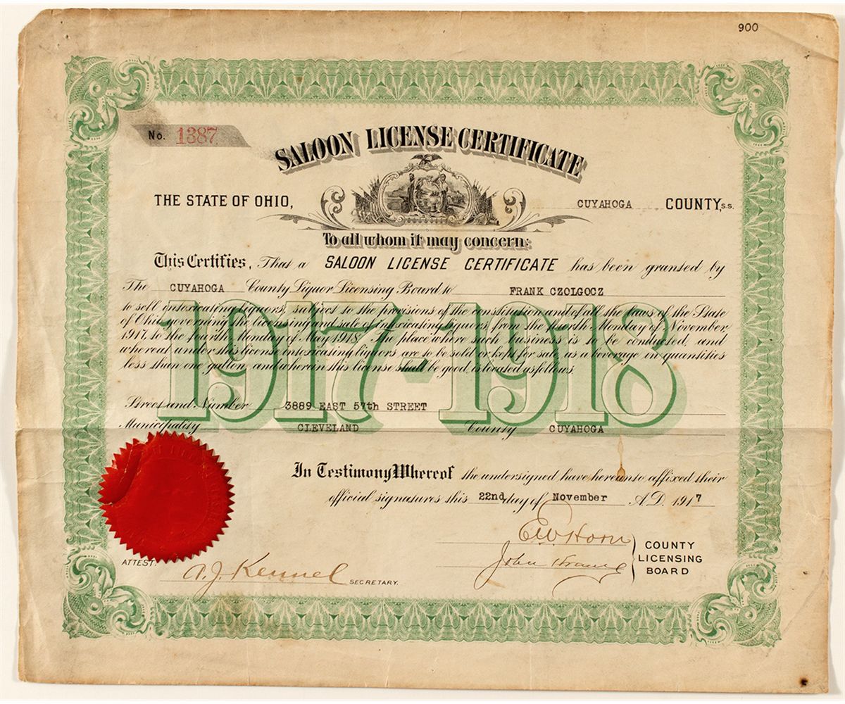License no. 1387, issued to Frank Czolgocz on November 22, 1917. There is some wear including tears and holes on the corners.City: County: Cuyahoga CountyState: OHDate: