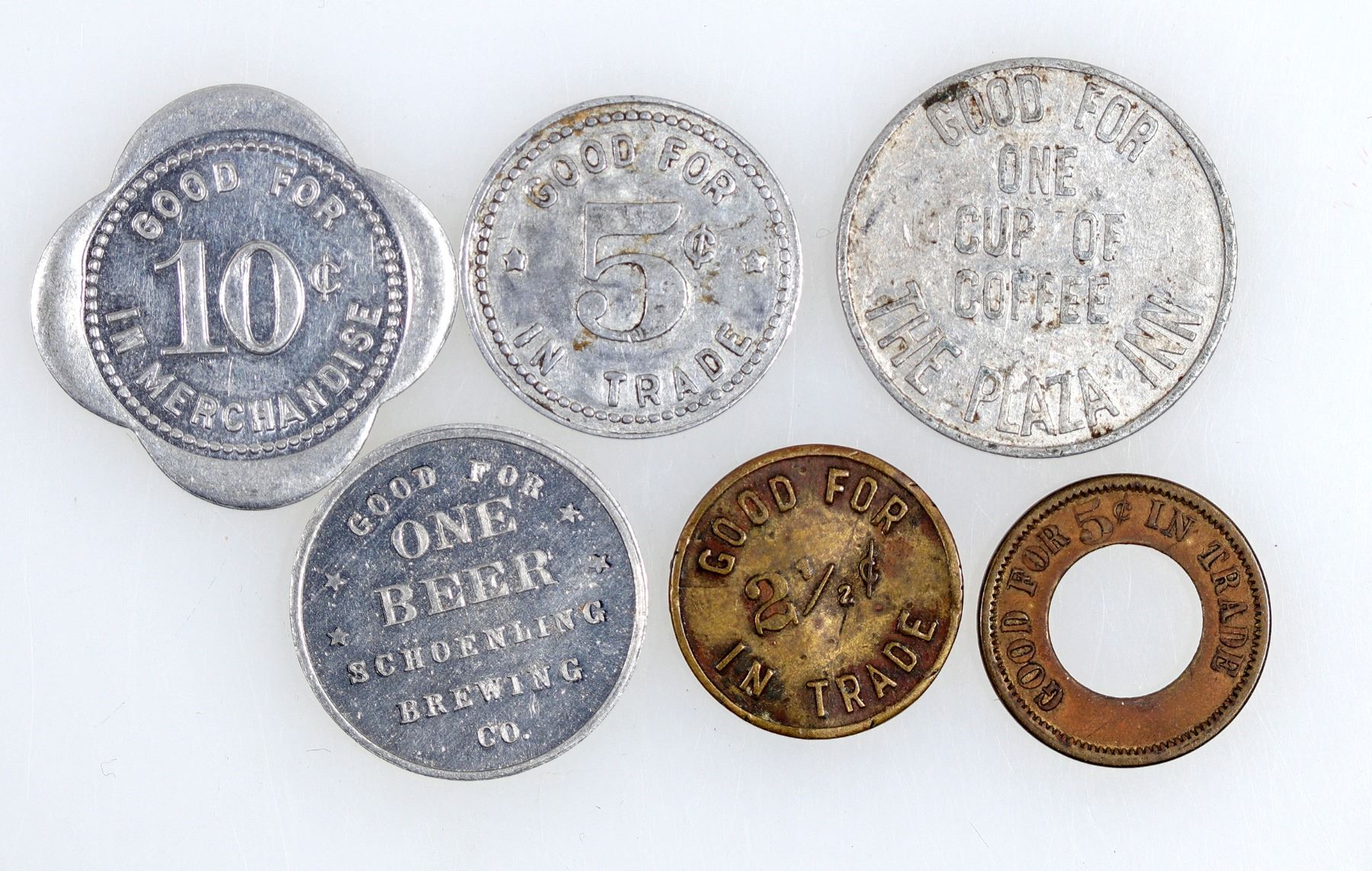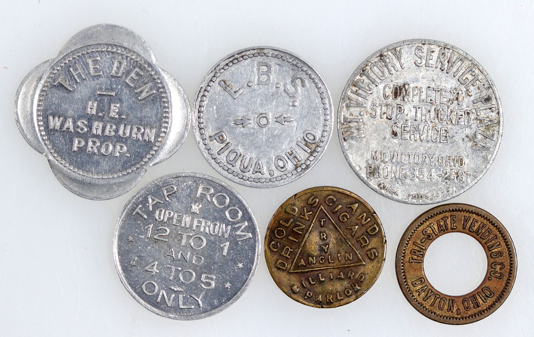Six tokens from Ohio: Schoenling Brewing Cincinnati; The Den, Leesburg; The Plaza Inn, Mt. Victory; Tri-State Vending, Dayton; L.B.S., Piqua. Ohio