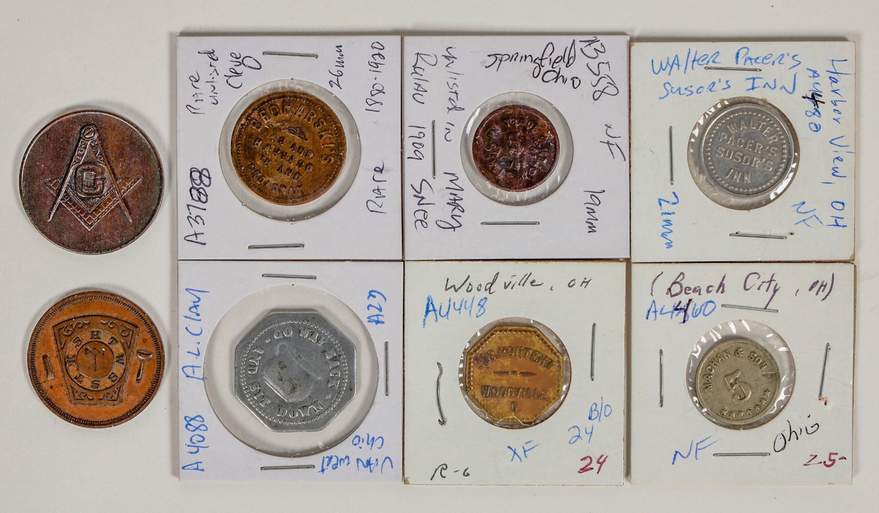 Eight tokens from Ohio: Van Wert chamber pot token; Marion masonic penny; Beach City; Cleveland; Springfield; Harbor View; Woodville.