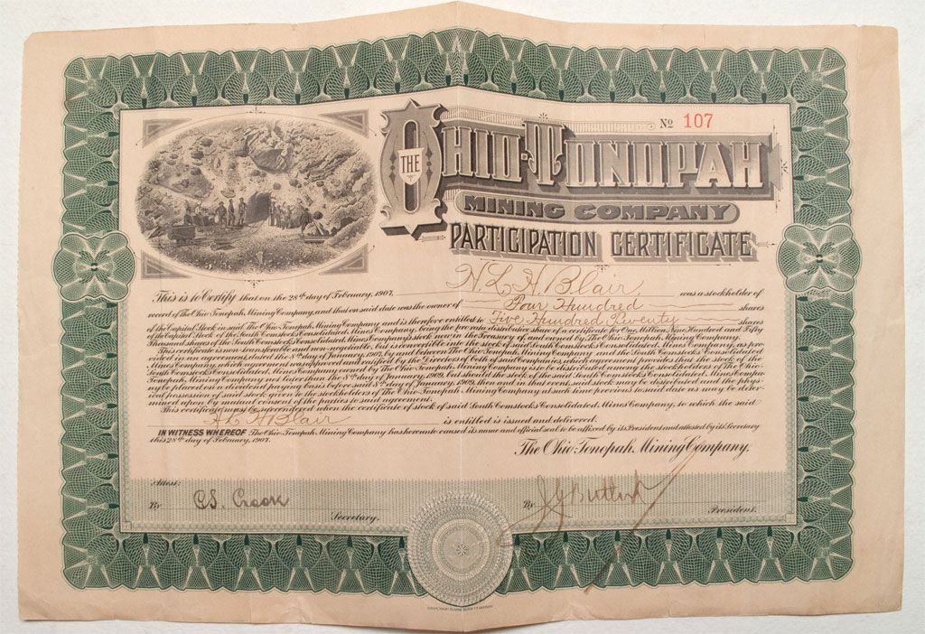 #107 Participation Certificate for H. L. H. Blair. Signed by president Jim Butler. Tonopah began circa 1900 with the discovery of gold and silver-rich ore by prospector Jim Butler when he went looking for a lost burro he owned. The burro had wandered off during the night and sought shelter near a rock outcropping. When Butler discovered the animal the next morning, he picked up a rock to throw at the beast, but instead noticed the rock was unusually heavy. He had stumbled upon the second-richest silver strike in Nevada history. (Ames Collection) Date 1907 Tonopah, NV hwac 3873