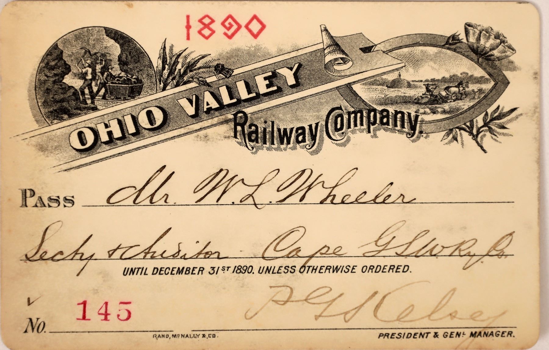Pass no. 145, issued for 1890 to WL Wheeler. Signed by president & general manager PG Kelsey. Red and black print on cardstock with two vignettes including rare mining vignette. Printed by Rand, McNally & Co. Toning and soiling. Operated 1871-1890. Succeeded by Pittsburgh, Ohio Valley and Cincinnati Railroad.