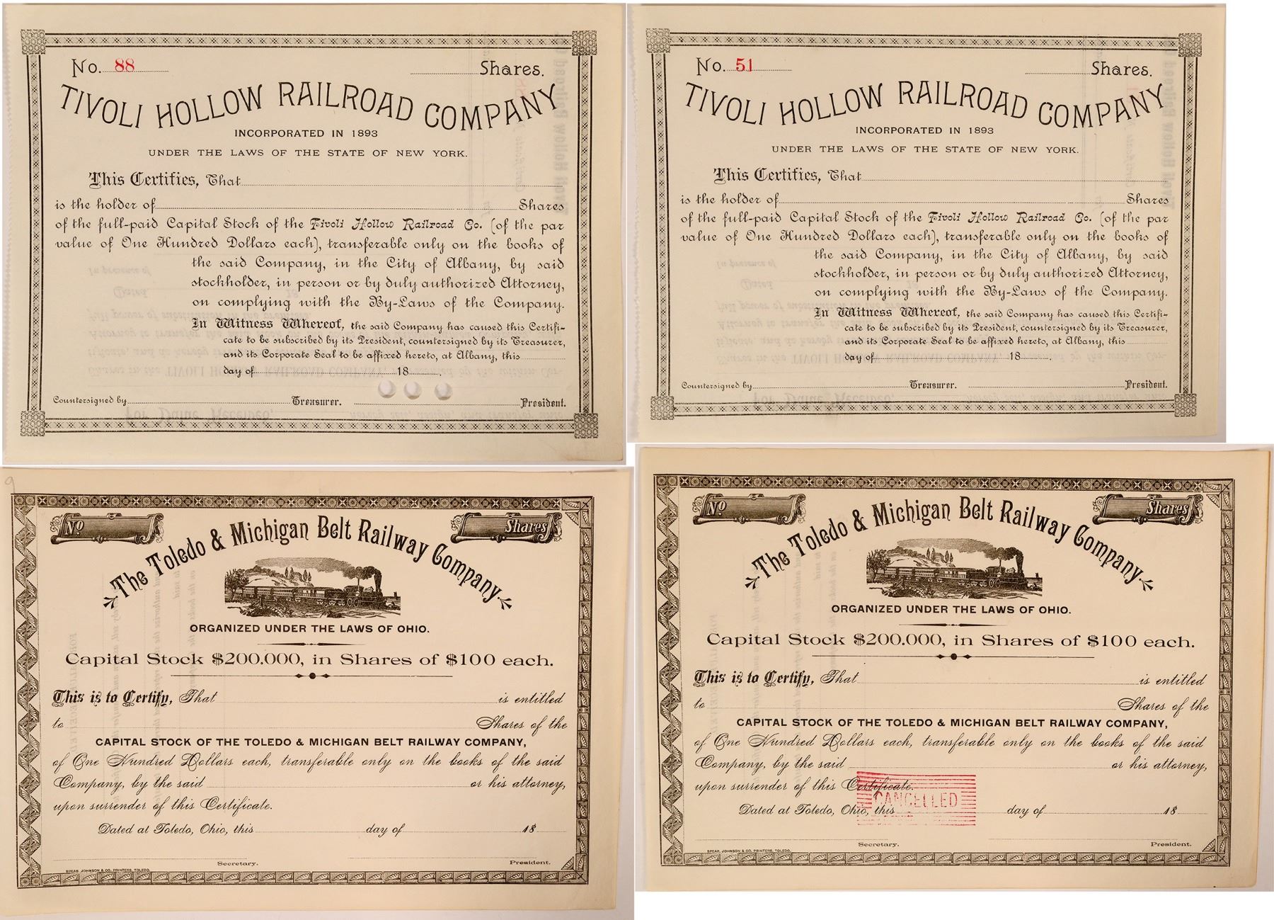 4 certificates. 1. Two certs. The Toledo & Michigan Belt Railway Co. started operations in Ohio in 1887 and stopped service in 1897 for a total period of operations of 10 years. Both Unissued, Not numbered, one cancelled. Dateline 18__, Black, vignette top of train l-r crossing bridge, $100 par. Spear, Johnson & Co printer. Near AU. 2. Two certs: Tivoli Hollow Railroad Co.was chartered in 1893.It was completed 1.23 miles (in the Tivoli Hollow section of the City of Albany, New York. Both Black, #51 (U/U) & 88 (U/C), no vignette, dateline 18__, unknown printer. Near AU.