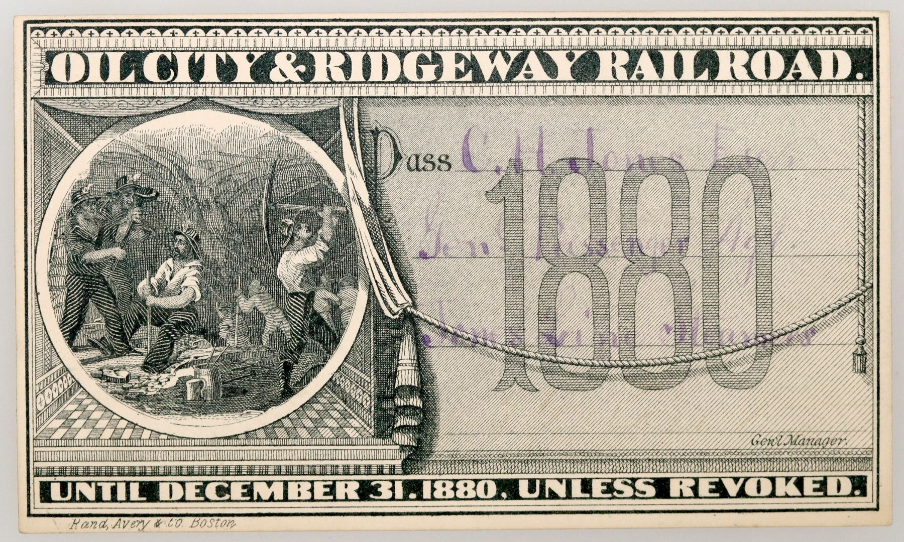 Fantastic pass with an ultra-rare underground mining vignette! Pass issued for the year 1880 to CH Jones of the Jones Line Steamers. Signed by general manager A. Kent (ink very faint). Great design with vignette of 5 miners with mining lamps. Printed by Rand Avery & Co., Boston. Ridgway is misspelled on the pass. Serviced the coal mines of Oil City, located in Venango County, Pennsylvania.