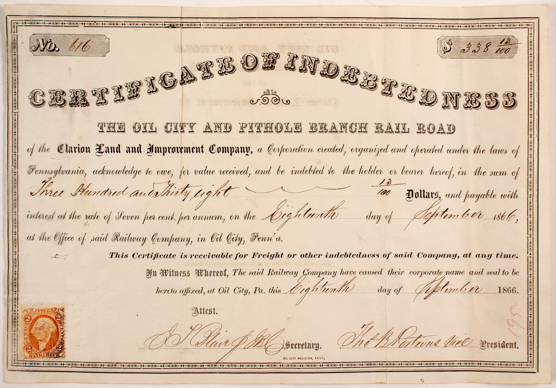 1 total certificate. It has a revenue stamp in the lower left corner; it has been signed by both the secretary and vice president, both illegible; NOT canceled. In very good condition, some folding lines. Printed by the Oil City Register, Print Company. Not listed in Cox. Prag Collection. City: State: Date: 1866 HWAC# 80677