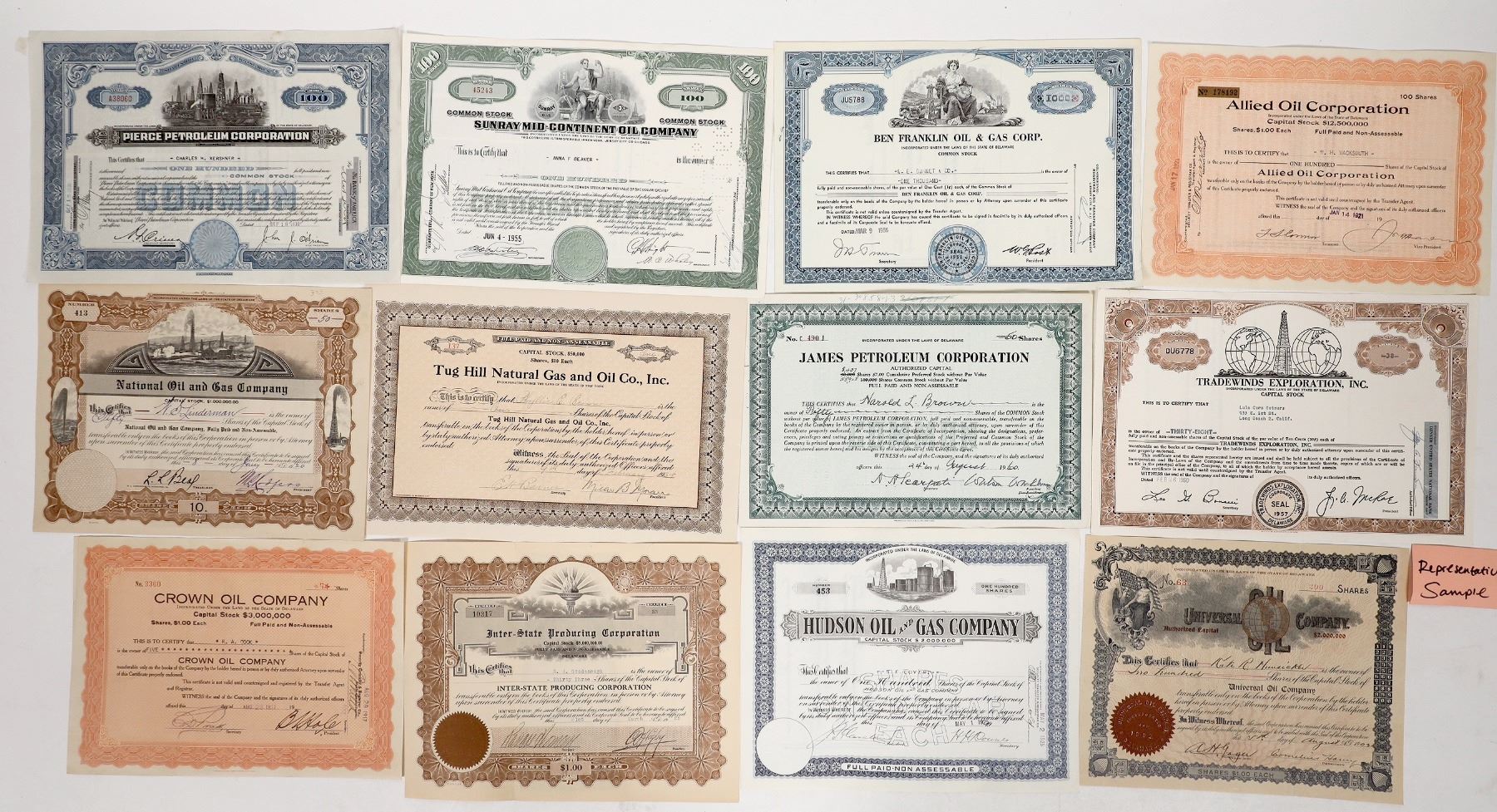 Collection of 27 stock certificates from 20 oil companies, dated 1902-1987; see photos for names of companies in lot. All are issued, a handful are cancelled or stamped with a notice of company name change. Lots of good oil field/oil derrick vignettes in the lot. All in generally good condition.