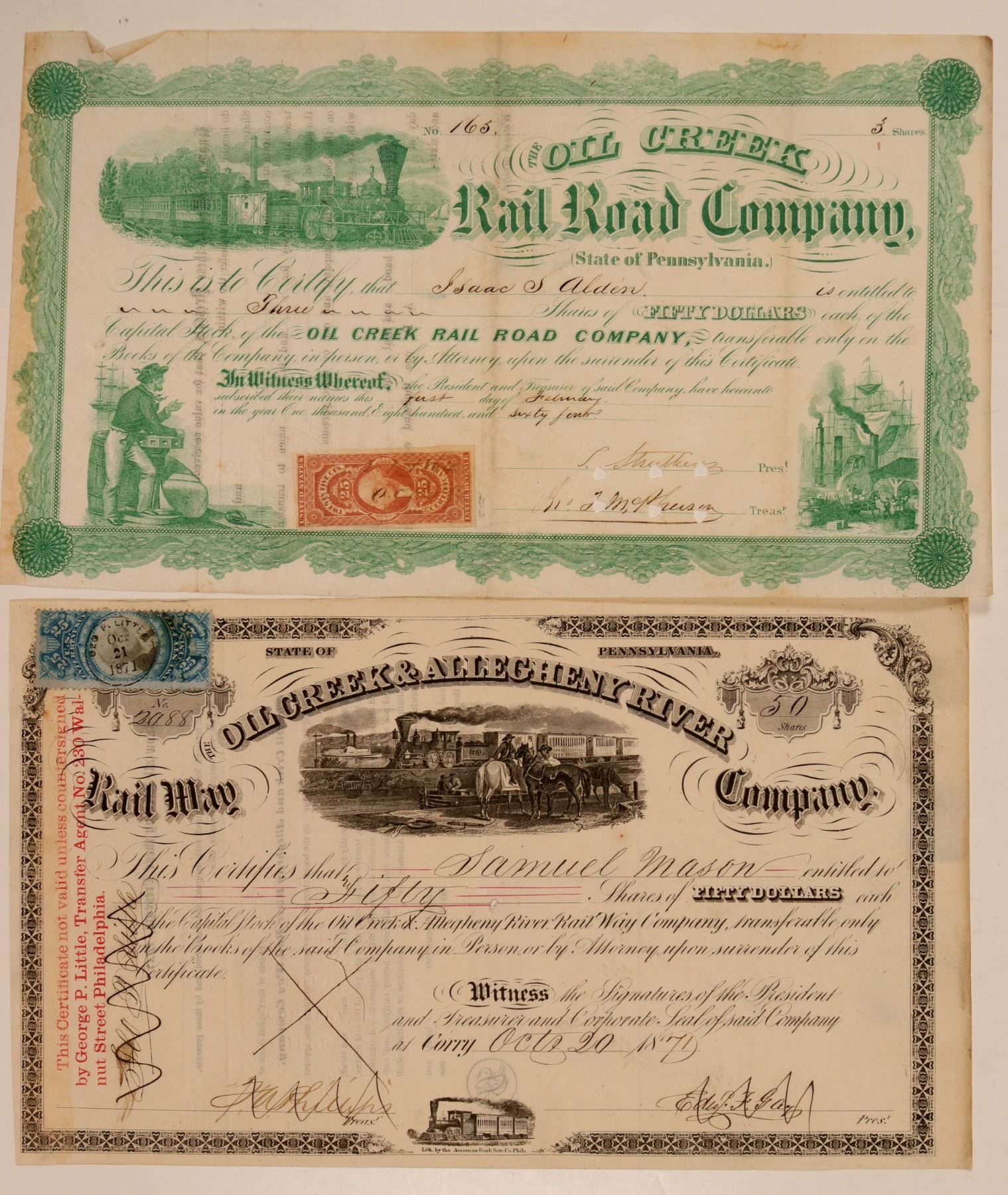 Two certificates. 1. Oil Creek Rail Road Co. incorp. 1860 Pennsylvania. #163, I/C, 3 shares $50 par issued to Isaac S. Alden Feb 1, 1864. Signed L. Struthers president. Green, embossed seal, vignettes: top train w/cars leaving town, bottom left sailor on cask, bottom right ships @dock. One 25C revenue stamp on front. Research has certificate #1 only one known. Henry Seibert & Bros printer. VF.