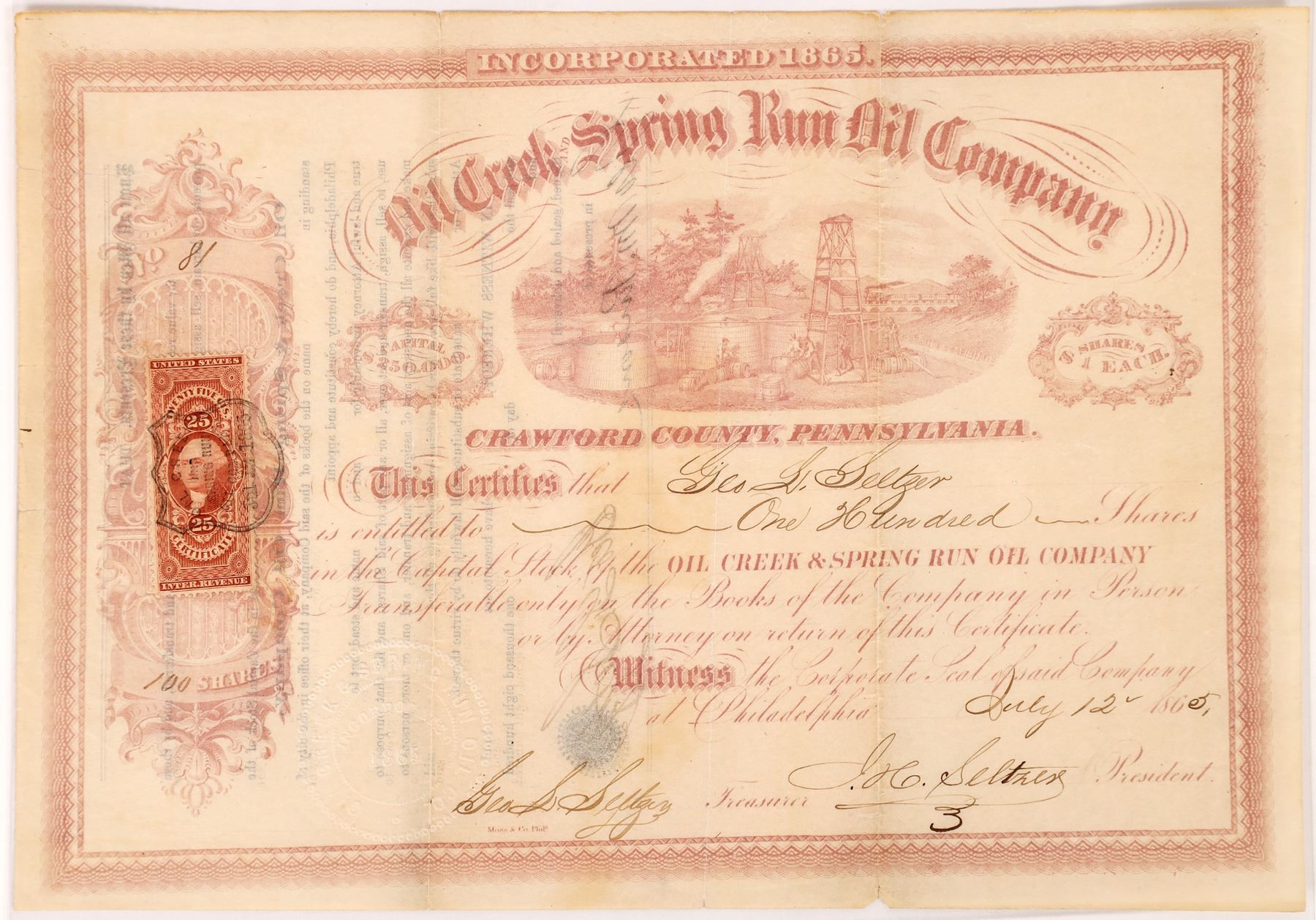 "Crawford County, Pennsylvania." printed under vignette. Inc. 1865. No. 81, issued for 100 shares to secretary Geo. Seltzer in Philadelphia in 1865. Signed by president Jh Seltzer and secretary Geo. Seltzer. Not cancelled. Red brown ink with vignette of oil derricks and tanks. Printed by Moss & Co., Philadelphia. 25 cent US IR Certificate revenue stamp attached on the left border. Deep folds with minor separation. 7.25 x 11" No additional information located. Crawford County Pennsylvania Ken Prag Collection