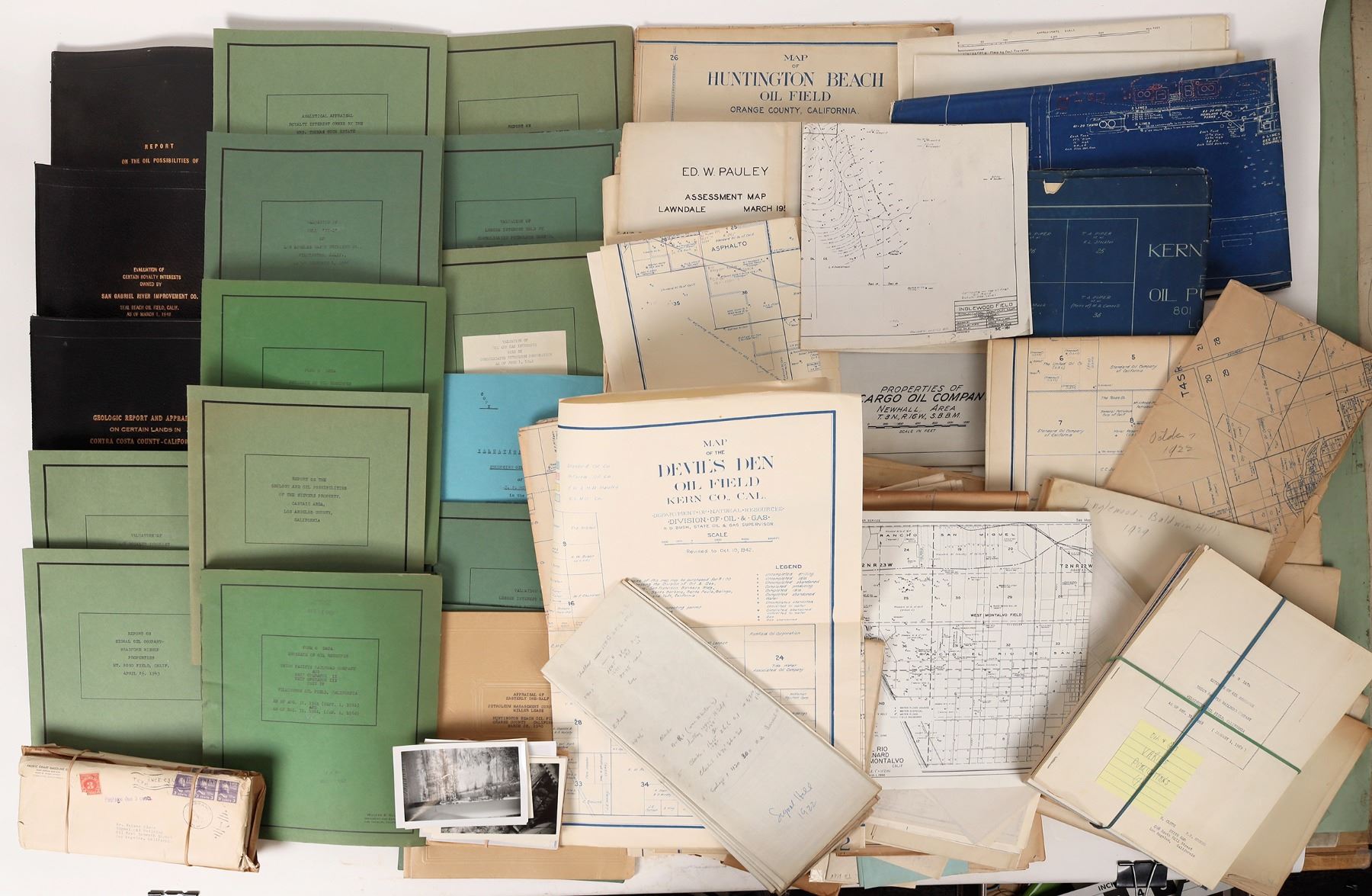 Oil & Gas Industry Archive (128 pieces). Collection from a Southern California Geologist & Petroleum Engineer, active during the period, 1920-1950. Consists of: 1) Major California oil field maps (32), on heavy paper stock, in sizes up to 42" x 54". 2) Smaller Calif. oil & gas field maps (9). 3) Calif. Oil Co. production records (4), for April, May, Sept. & Nov. of 1947, produced by Pacific Coast Gasoline Co. 4) Individual file folders for valuation & appraisal reports for petroleum companies (15). 5) Various publications (7), concerning oil & gas production. 6) Plates (18), from U.S.G.S. Professional Paper No. 163, "Significance of Geologic Conditions in Naval Petroleum Reserves No. 3, Wyoming, 1931. 7) Sets of 1953 & 1957 Lawndale photos (15), and set of 1960 unknown oil operation (21) - (all are either 3-1/2"x 5" or 4" x 5"). 8) U.S.G.S. Geologic formation charts (6) for California, Oklahoma, Texas, Kansas, Wyoming & New Mexico (1925-1927). Includes 10 Early postcards.