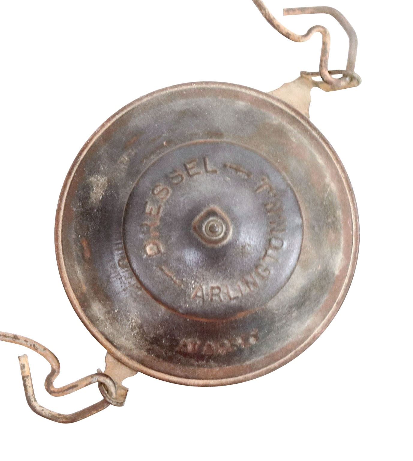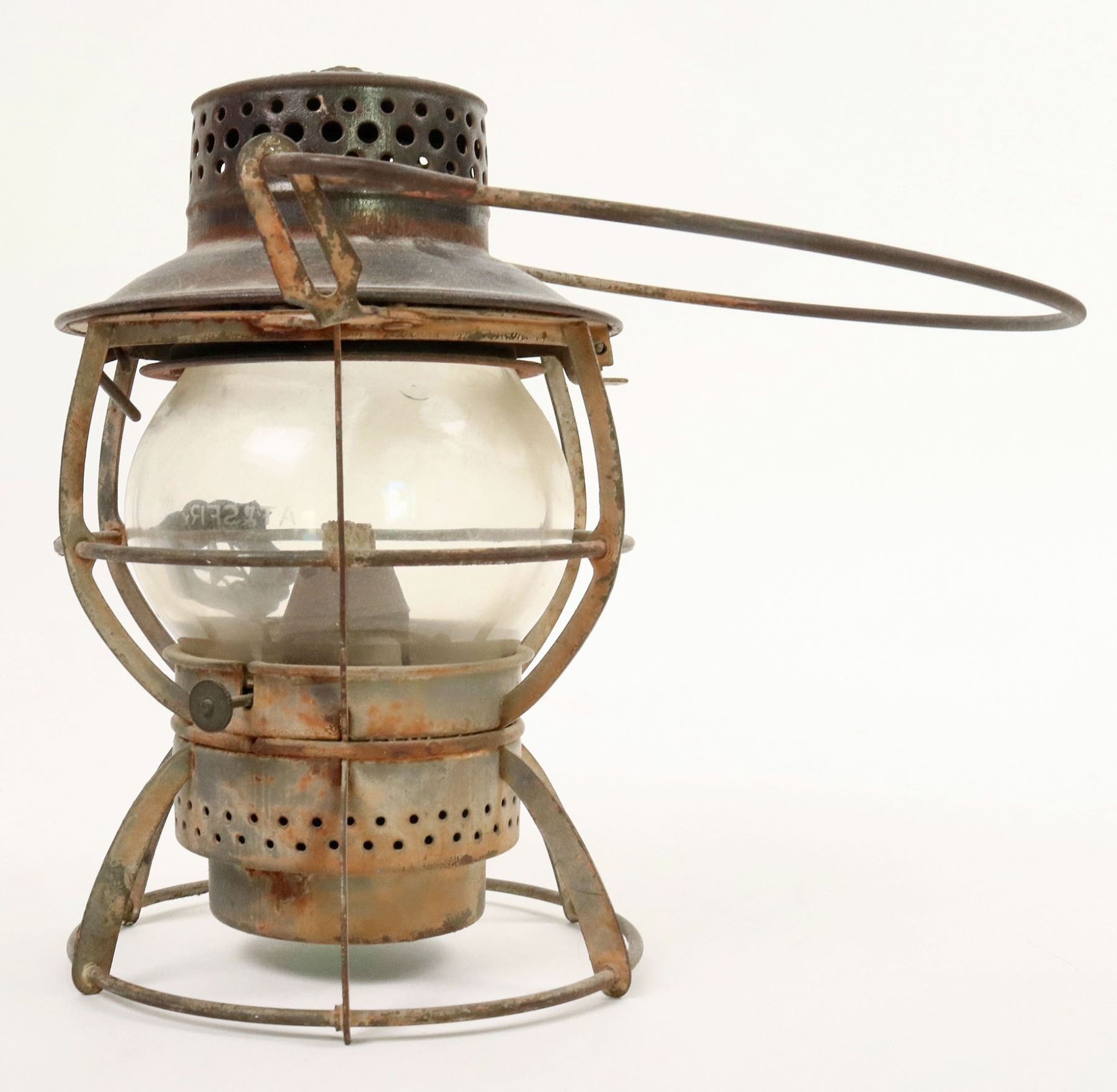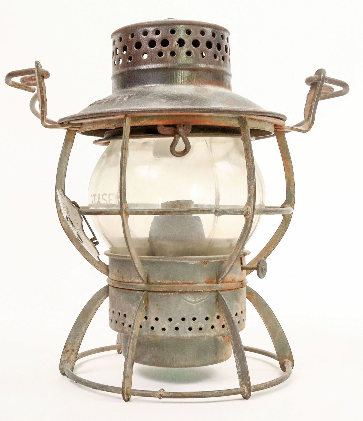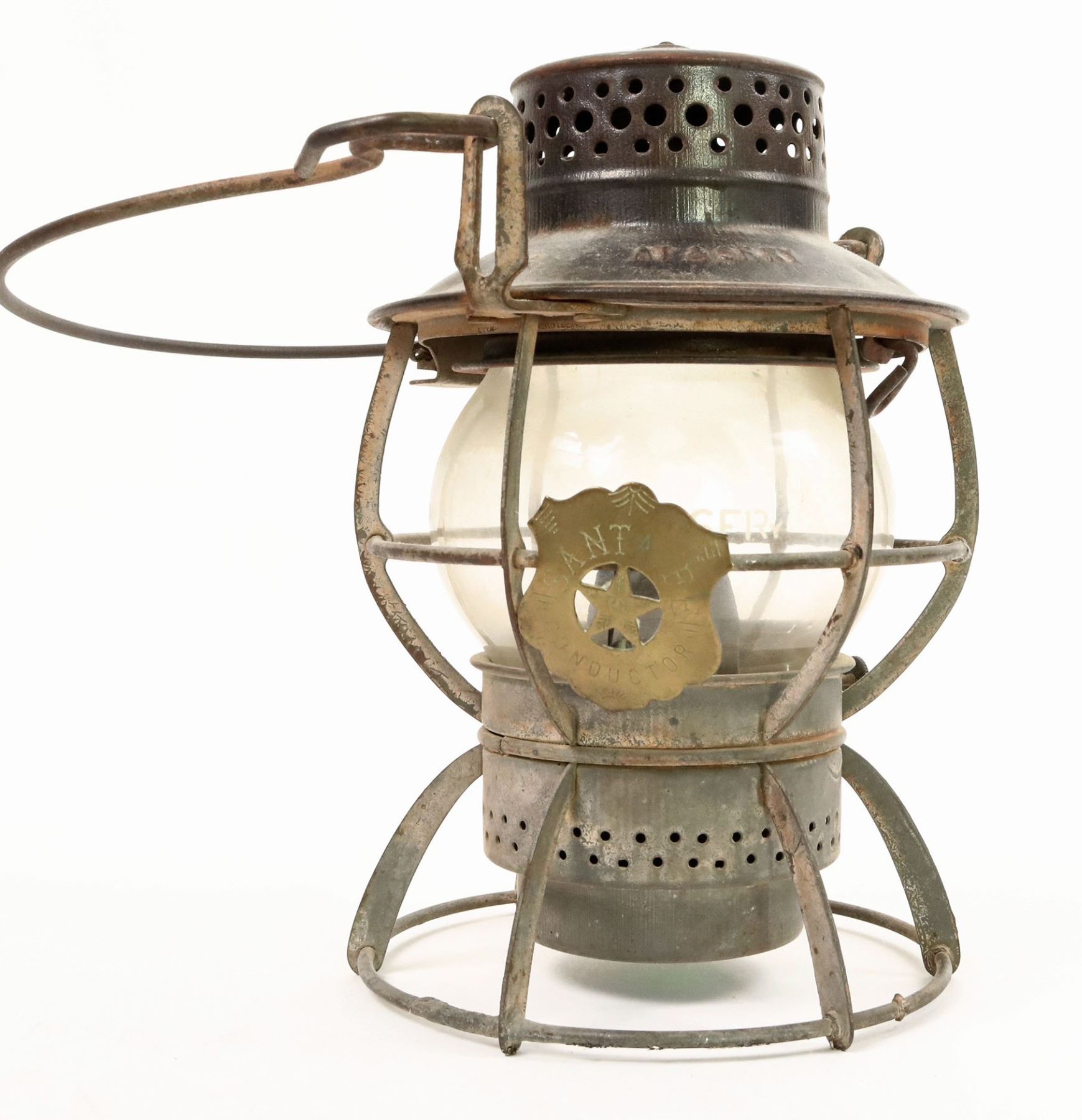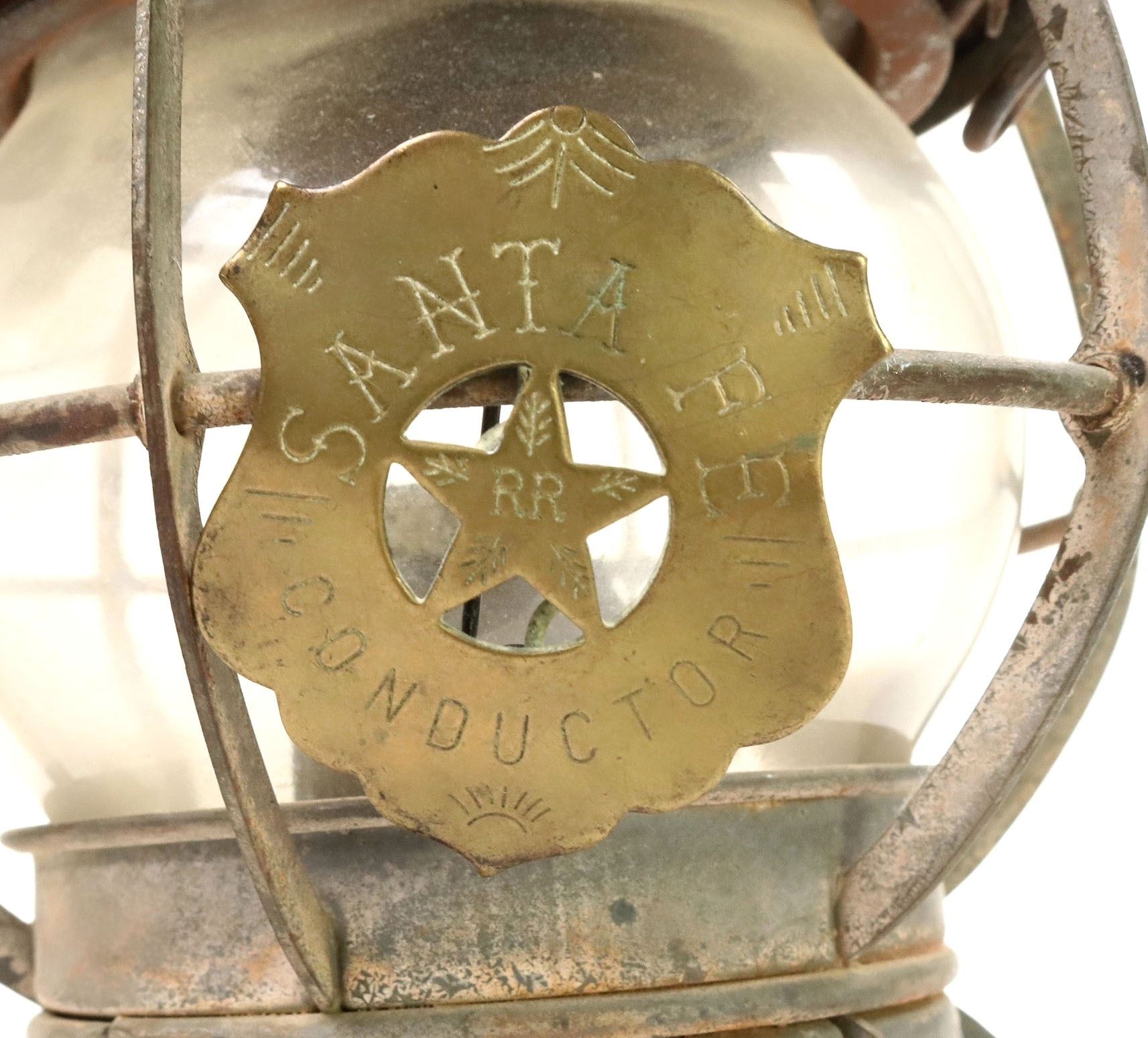 Atchison Topeka & Santa Fe Railway Company oil lantern and brass conductor's badge. Mid-19th century. Brand is Dressel-Arlington, N.J. Still has its burner and wick. "AT & SF Ry" etched on clear globe. 15.5" x 9".