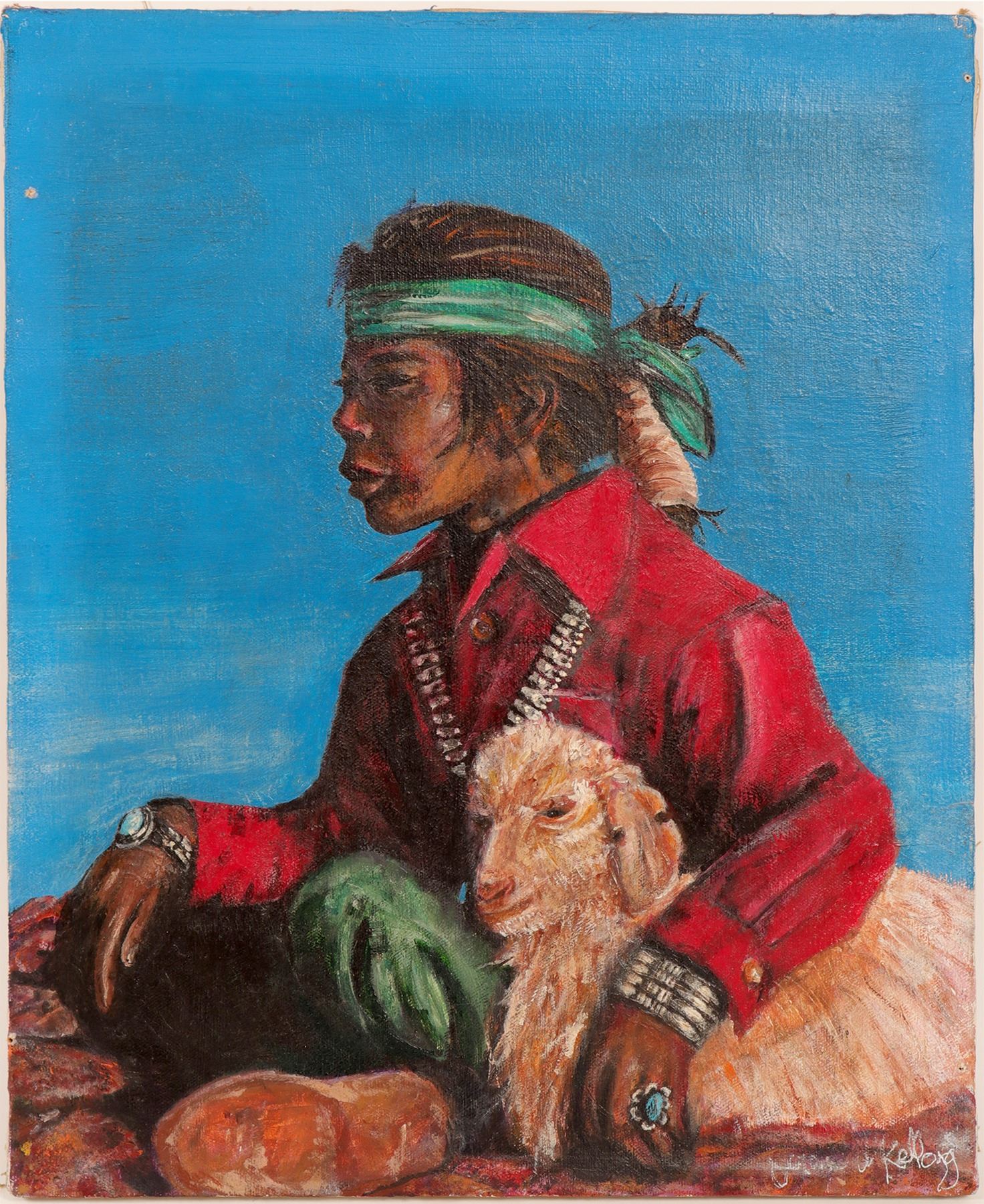 Here is a very nice piece . It is a painting of a Native American boy, and a lamb. It is also signed by the artist, Edmund Philo Kellog, who was well know, for his Native American oil paintings. Possibly unlisted , and one of his last works. 18" tall x 14" wide, ready t be framed and hung. No information on this exact item, was found. Very rare and unique. Bight colorizations, and good detail. (RH)