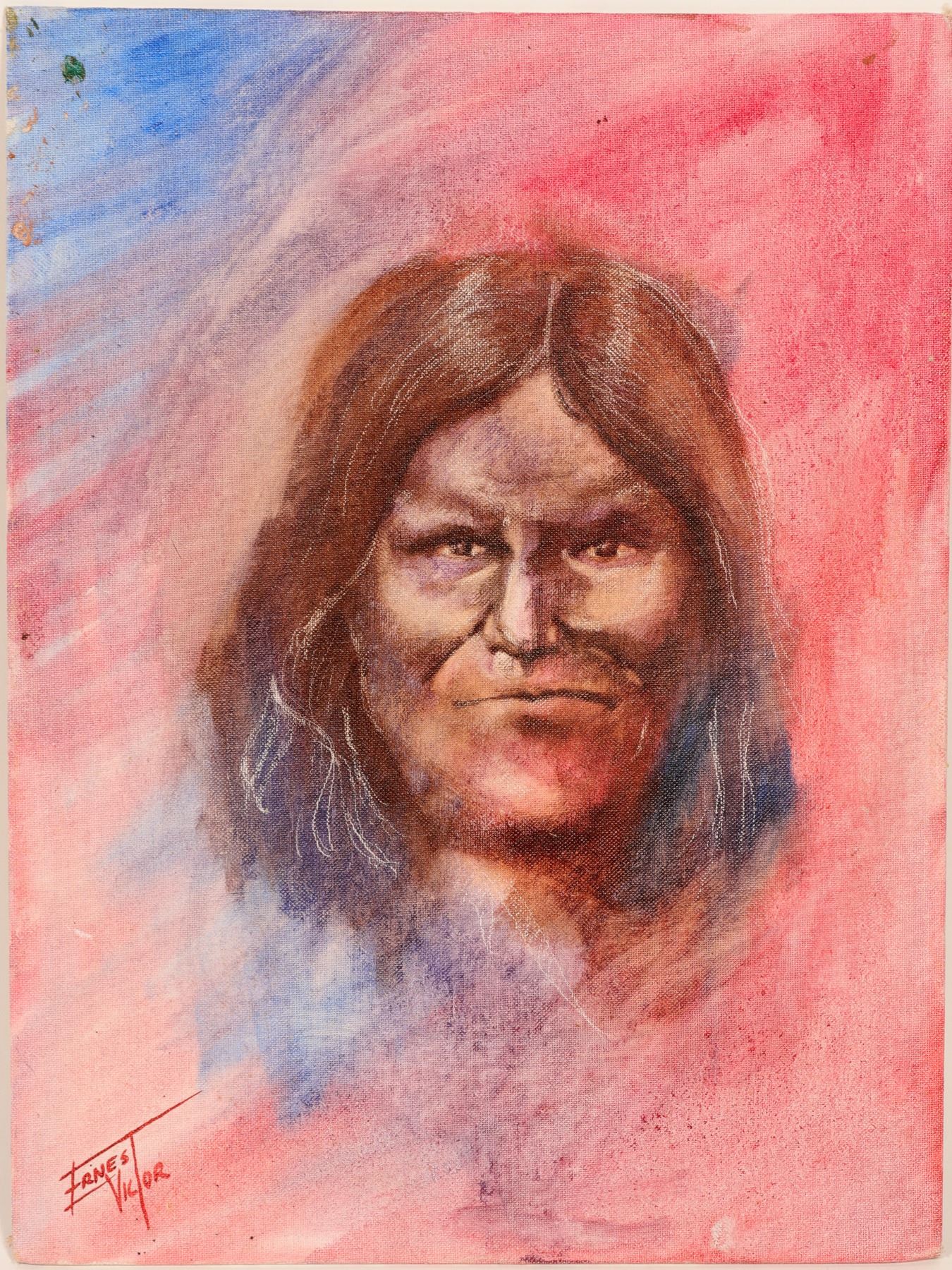 Here is a nice painting , of a famous Native American warrior . It is a painting of "Geronimo", who was a medicine man and chief, of the Bedonkohe band. He lived from 1829-1909, and was the last warrior to surrender to the U.S.Government. Very good detail, and a true likeness. It was painted and signed by Ernest Victor, Jr. He was a councilman and a member of the San Carlos Apache Tribe. 16" tall x 12" wide and ready to be framed and hung. Rare, and unique piece (RH).