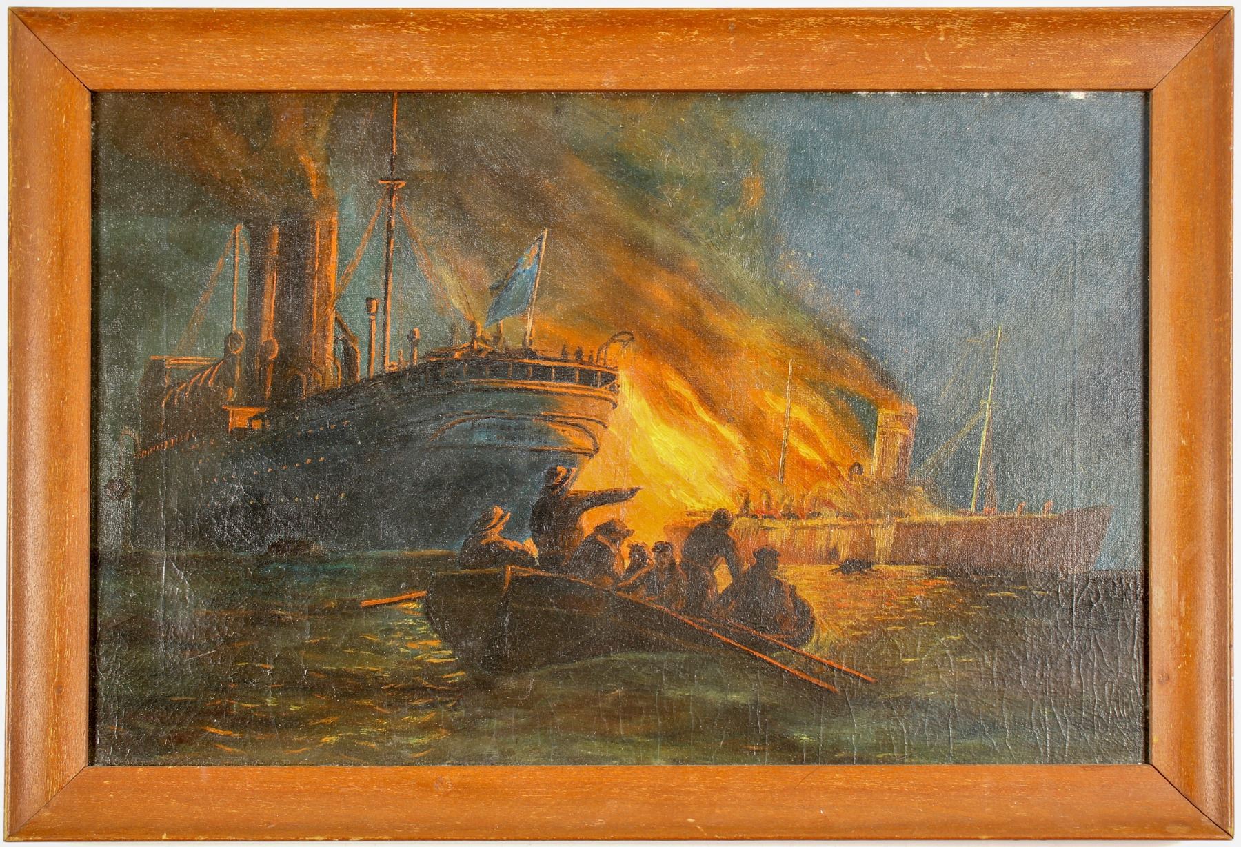 24.5" x 17". Original oil painting (unsigned) night scene of ship ablaze & sinking. It appears to be between 1900 & 1905. Frame has a little wear, please inspect. State: City: Date: 1900's HWAC# 85813