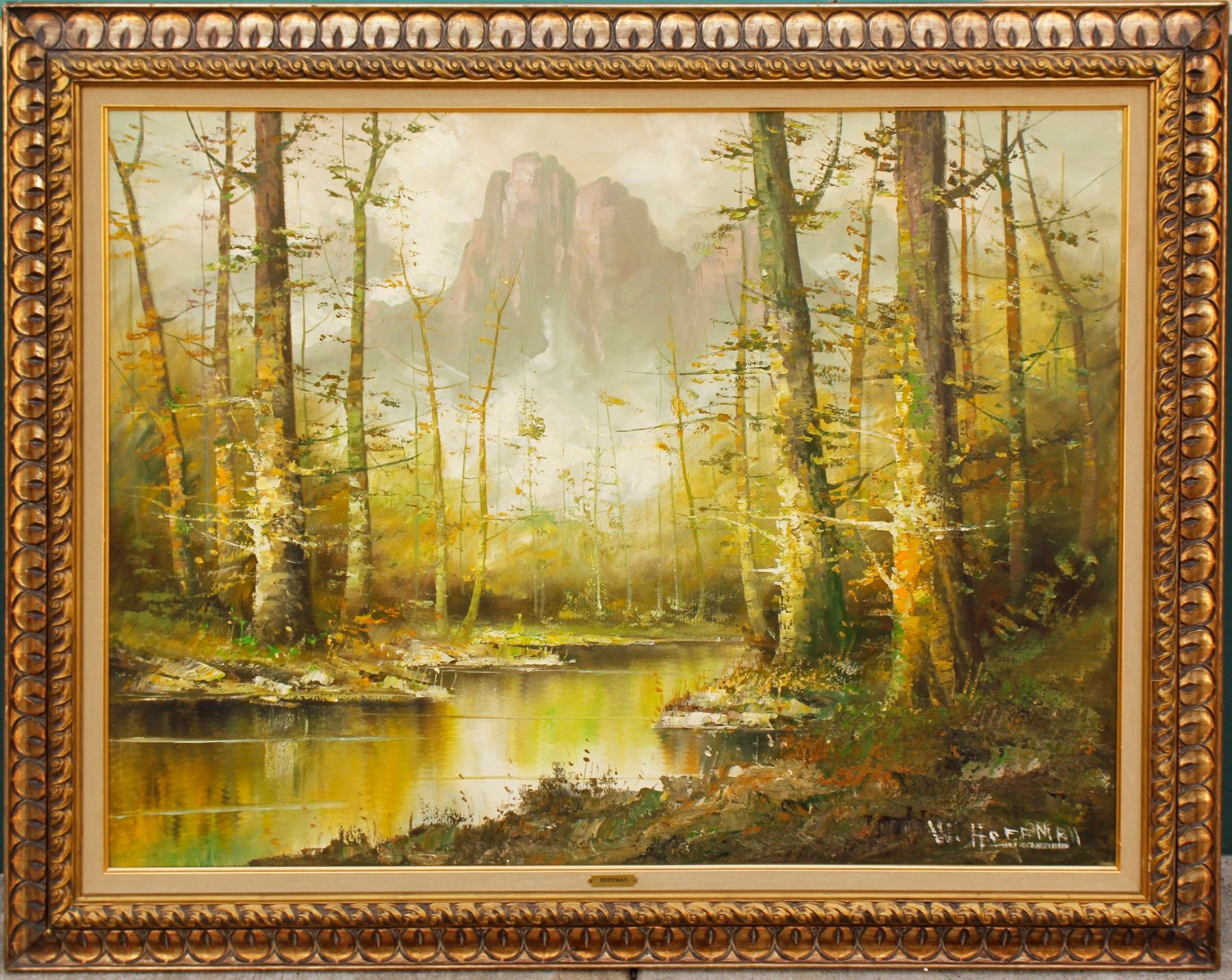Beautiful River landscape, oil on canvas, signed W. Hoffman, lower right, overall (with frame): 48"w. x 38"h. Frame has been professionally restored. This original oil glows with beautiful yellows, golds, greens with shimmering river running through the landscape. W. Hoffman was raised in Montana, & worked cattle ranches throughout the state. Following high school, he thought he might settle down on a ranch near Choteau, but the Marine Corps had other ideas, which included island hopping in the Pacific for three days during WWII. After the war, Bill enjoyed life, wandering through three colleges. The various curricula included three majors and two minors, but never an art course. To this day, he remains completely self-taught. In 1964, as regional manager for ASCAP, Bill attended a convention in San Francisco and somehow bumbled into an art gallery. "I'd never seen one before, and I was stunned to learn that artists didn't necessarily always starve." (AskArt.com) W. Hoffman 1924-1995. Known for western genre, seascape, landscape.