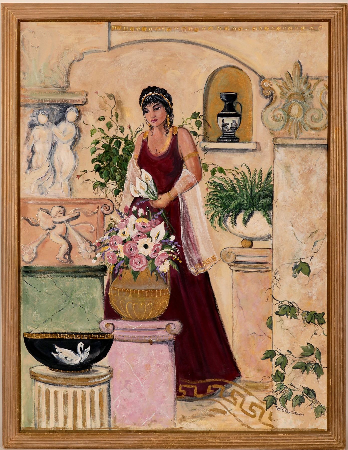 Here we have a very beautiful oil painting. It depicts, a beautiful dark haired Grecian beauty, in her home around 34 B.C. I call her " The Goddess" ( I made up that name, the painting is, untitled) There are many Greek Key designations all over the scene, including Grecian bowls and urns. This painting was done and signed by Terri Brody Elenzweig. She is 80 years old, still alive and well and lives in Florida today . And is still painting. Framed an ready to be hung. Size is 51 1/2" x 40" wide. Would look great in the hallway, by the entrance door, or any other place of importance in your home. Fine piece ( RH).