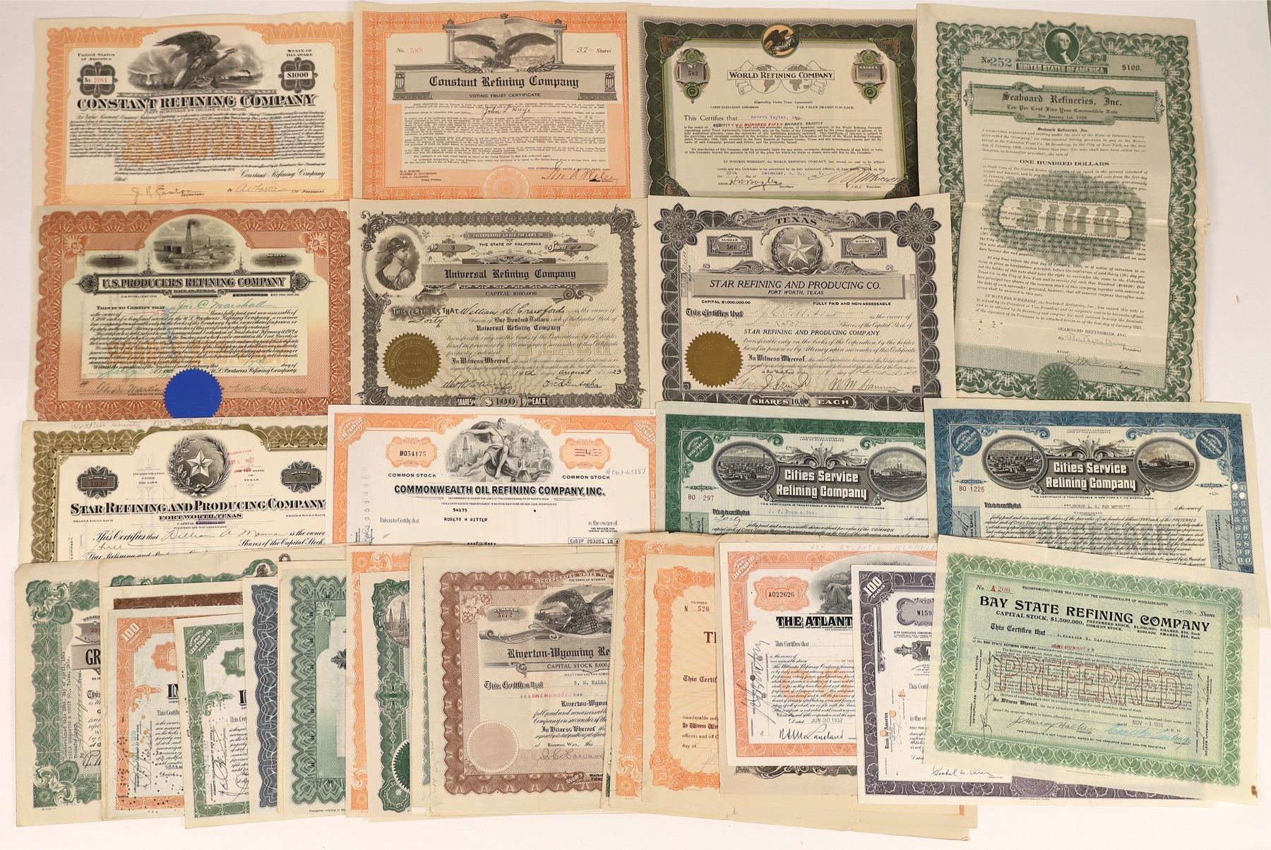 A load of stock certificates issued by various and sundry oil refineries. Most are endowed with beautiful vignette. A few examples include Star Refining and Producing Company of Fort Worth, dated 1903, Seaboard Refineries, Inc. dated 1921, U.S. Producers Refining Company, dated 1920, Universal Refining Company, dated 1923, World Refining Company, dated 1920, Constant Refining Company, dated 1925, Commonwealth Oil Refining Company, Inc., dated 1973 and several more. Please see photos for more detail and condition.