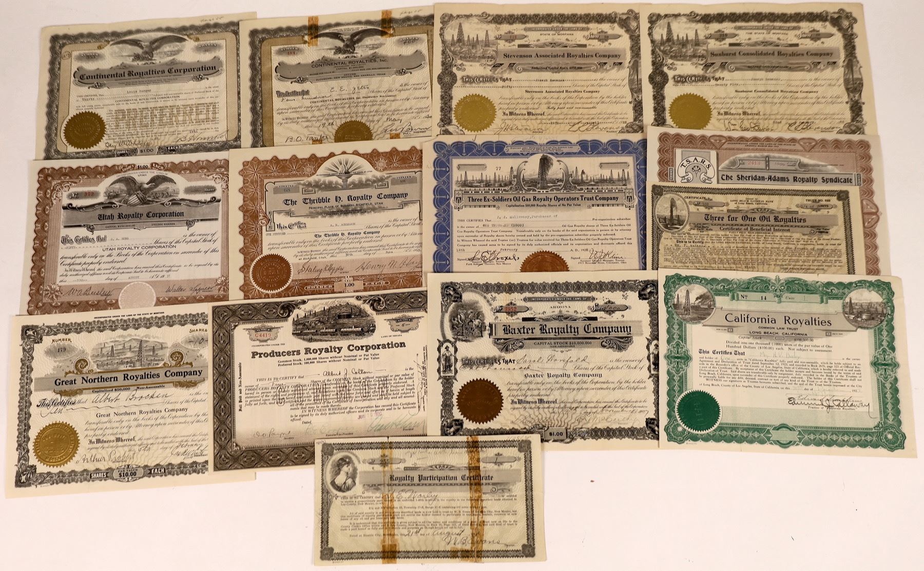 Oil royalty company stock certificates from various parts of the country. A few examples include Great Northern Royalties Company, issued in 1927, nice oil derrick vignette, Producers Royalty Corporation, issued 1930, with an impressive RR tank car vignette. Baxter Royalty Company, issued in 1907, California Royalties, issued 1923 two oil derrick vignettes. and more. Please see photos for more detail and condition.