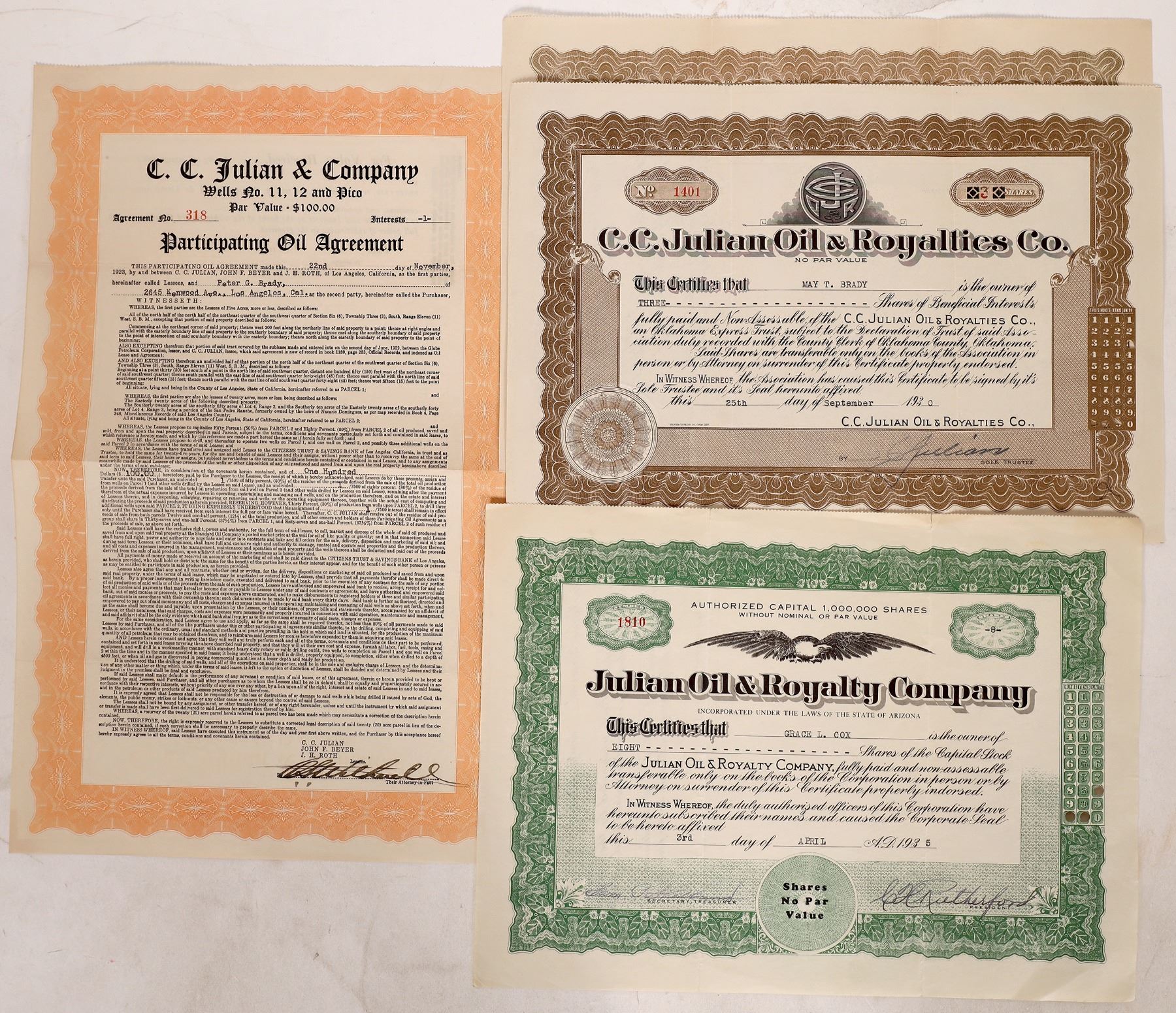 Great Los Angelas Swindle! Oil Scam Stocks - Issued 1930, 1931 and 1935 Julian Oil & Royalty stocks. Both browns have CC Julian signatures. Julian was a swindler from LA which led to the largest financial fiasco in Southern California history. Julian was main character of the book "The Great Los Angeles Swindle." Joined forces with a Texan named S.C. Lewis incorporating company to create an oil refining company, The Julian Petroleum Company (known as "Julian Pete"). Lewis soon took control of Julian Pete. Put in play strategies such as hiring one FBI accountant investigating the company. Things were heating up at Leadfield, but commission put a stop to Julian selling his mining company's stock. Green has .5" crease tear. [Los Angeles] [California] [Ken Prag Collection]