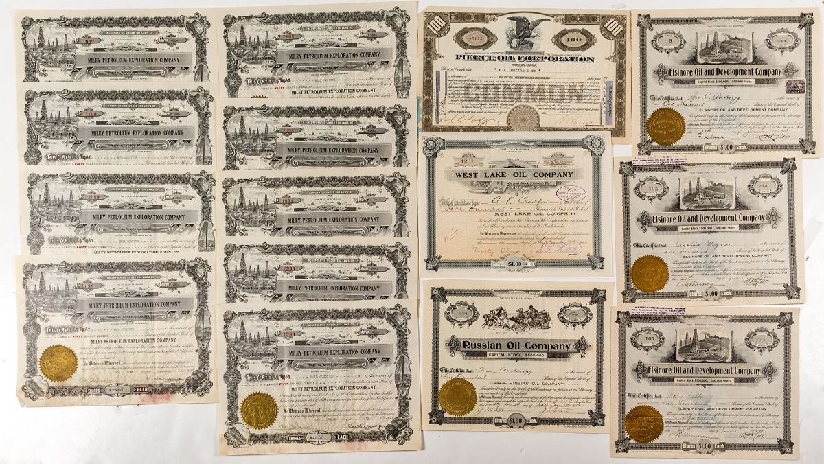 Lot of 16 pieces: Miley Petroleum, Pierce Oil, West Lake Oil, Russian Oil Company, Elsinore Oil and Development. Some duplicates. City: State: Date: ID# 40552