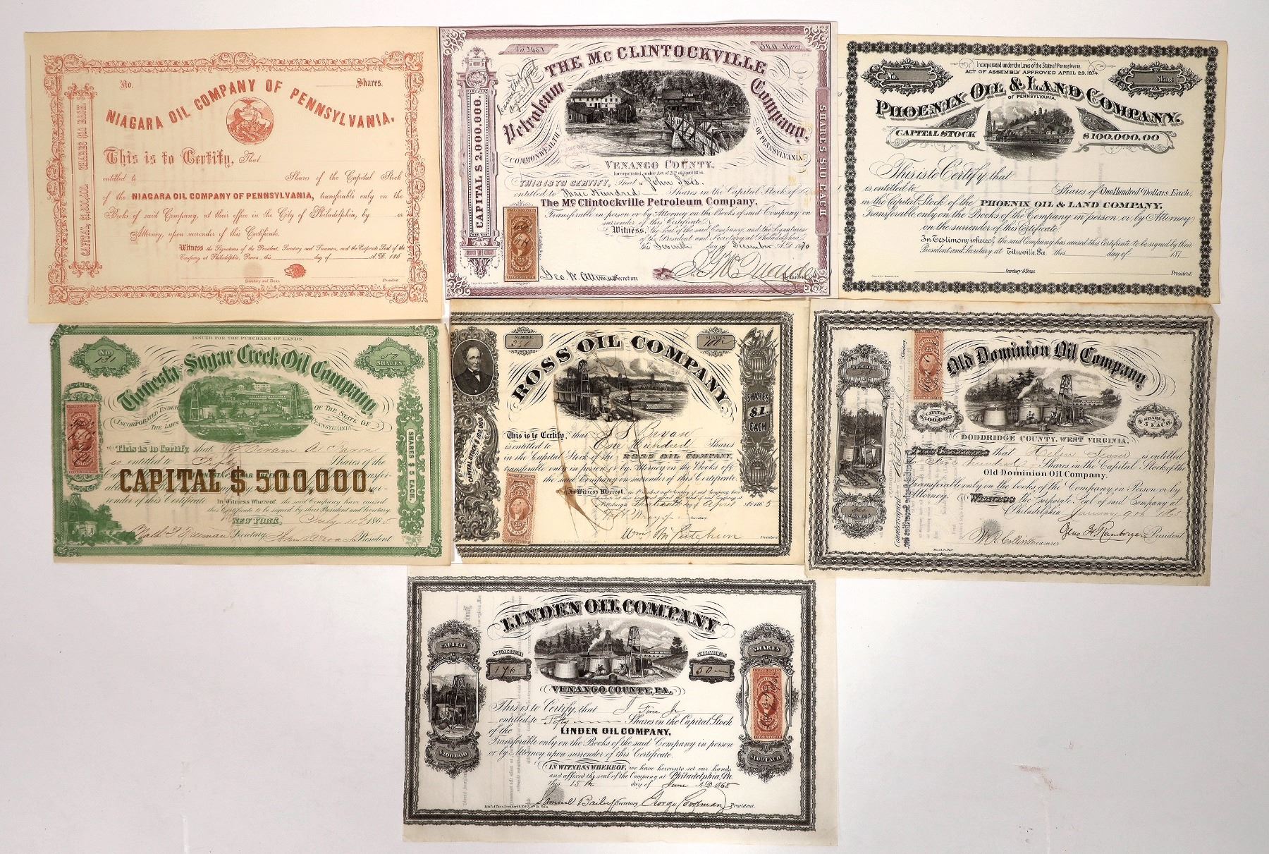 Issued-1865 Tionesta and Sugar Creek Oil, "Property included 209 acres on Tionesta Creek in Venango County; on Sugar Creek in Warren County; in Cuba, Allegheny County; and in Ishua, New York [Times Union, 01 Sep 1865]. 1865 Linden Oil, Venango County, PA-According to a Sept. 1864 ad for the company, their property was situated at the mouth of Oil Creek. In January 1865, they paid a dividend. 1865 Old Dominion Oil-Doddridge County, WV and nice derrick vignette. 1865 Ross Oil, vignette with many barrels and derrick, articles report many dividends paid, and the location of wells to be Venango County, trimmed tight on left. McClintockville Petroleum, Venango County, PA-Beautiful vignette of bridge over river near village with one building labelled "McClintock House." Owned the Greenfield, Wright, & Whitman wells on the McClintock Farm at Oil Creek, Venango County, PA [The Petroleum Centre Daily Record, 26 July 1869]. Unissued-Niagara Oil Co. of Pennsylvania. Phoenix Oil & Land Co. of Pennsylvania, it would have been issued at Titusville in the 1870's. Nice derricks and trains vignette.