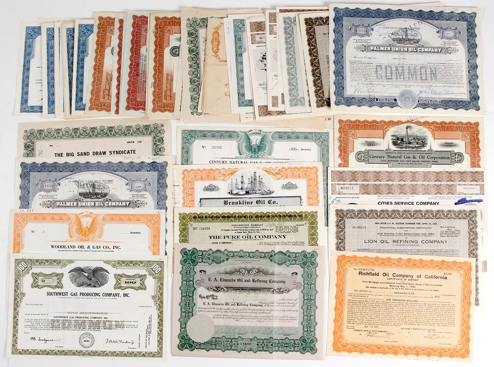 Approx 86 stocks and 2 bonds, some dupes, 30 different. Big Indian Royalty Pool, Big Sand Draw Syndicate, Palmer Union Oil, Brookline Oil, Lion Oil Refining and more. Date: Location: HWAC# 64303