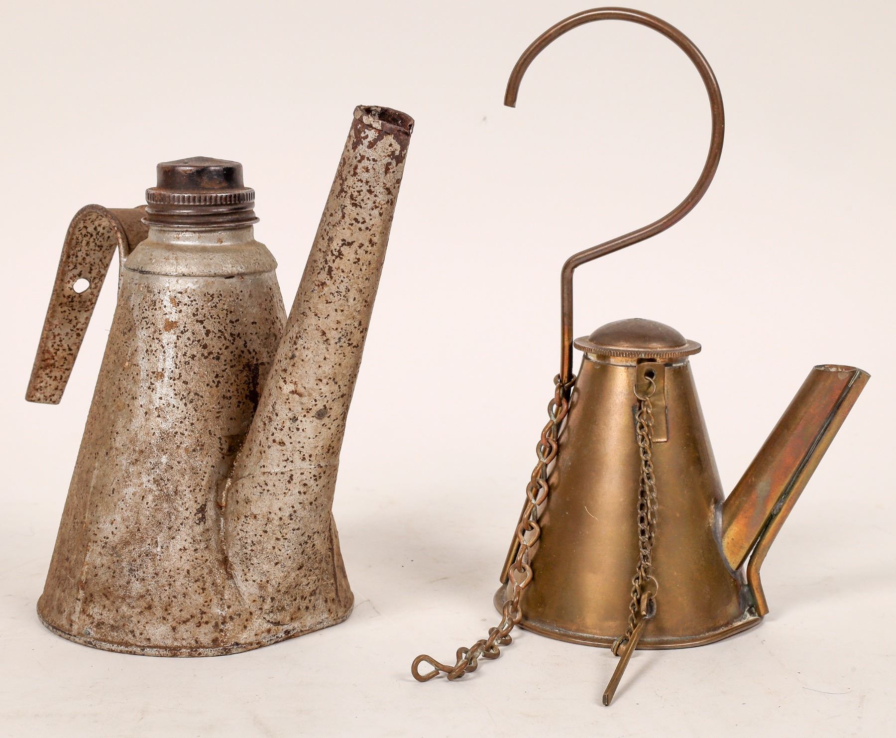 2 different oil wick lamps. Large unmarked steel lamp 7.75" tall, dent under spout base. Brass unmarked lamp with hook handle, 9" tall, small base bend under spout.