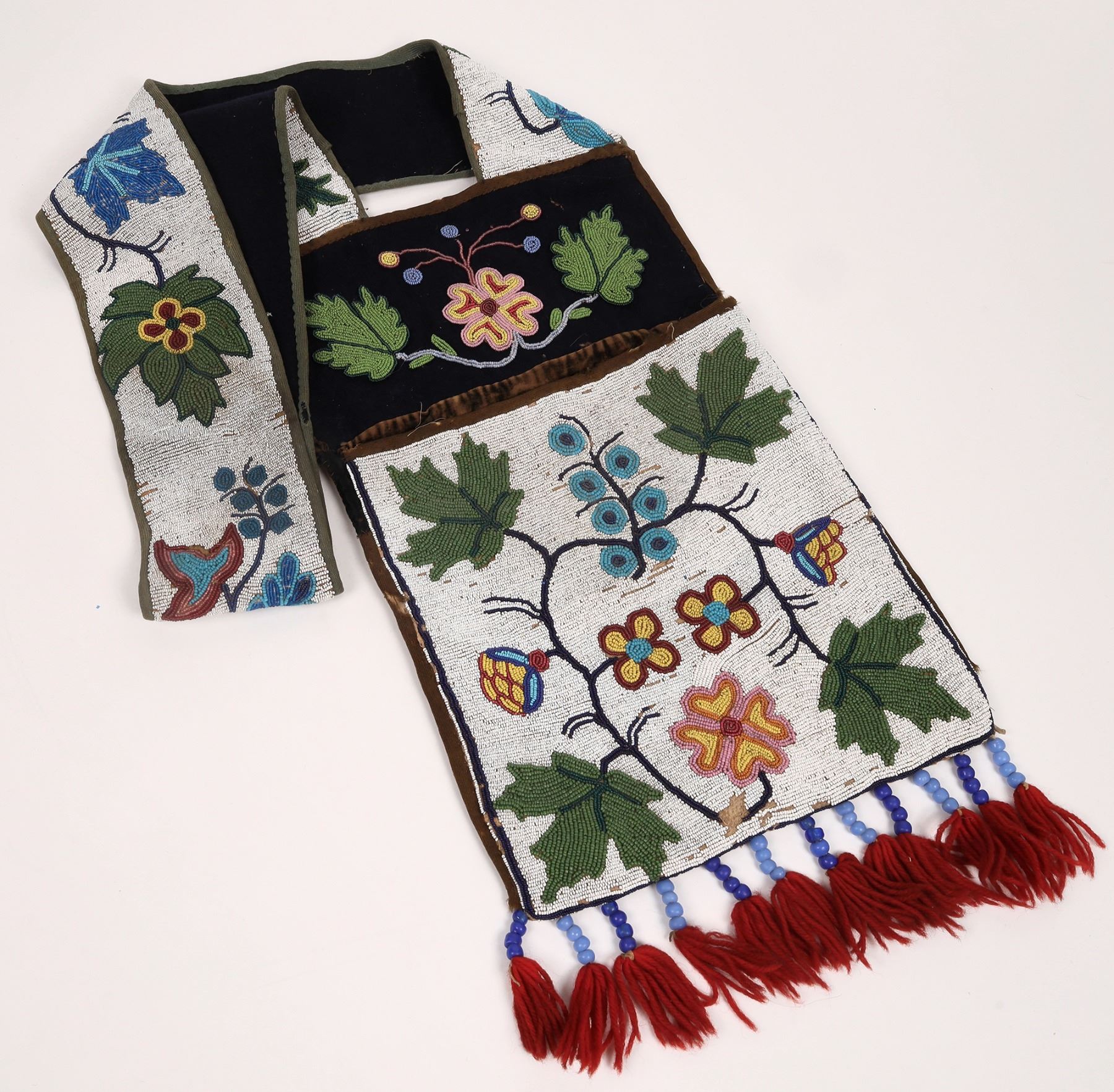 An 1880's Ojibwe bandolier bag with a loom beaded strap and panel, spot stitched panel between them. Bag's panel has an abstract floral design and the two panels of the strap each have different designs, both elements commonly seen on Ojibwe bags. Worked with naturalistic floral/leaf sprays on the body, tassel suspensions below. 39" long.