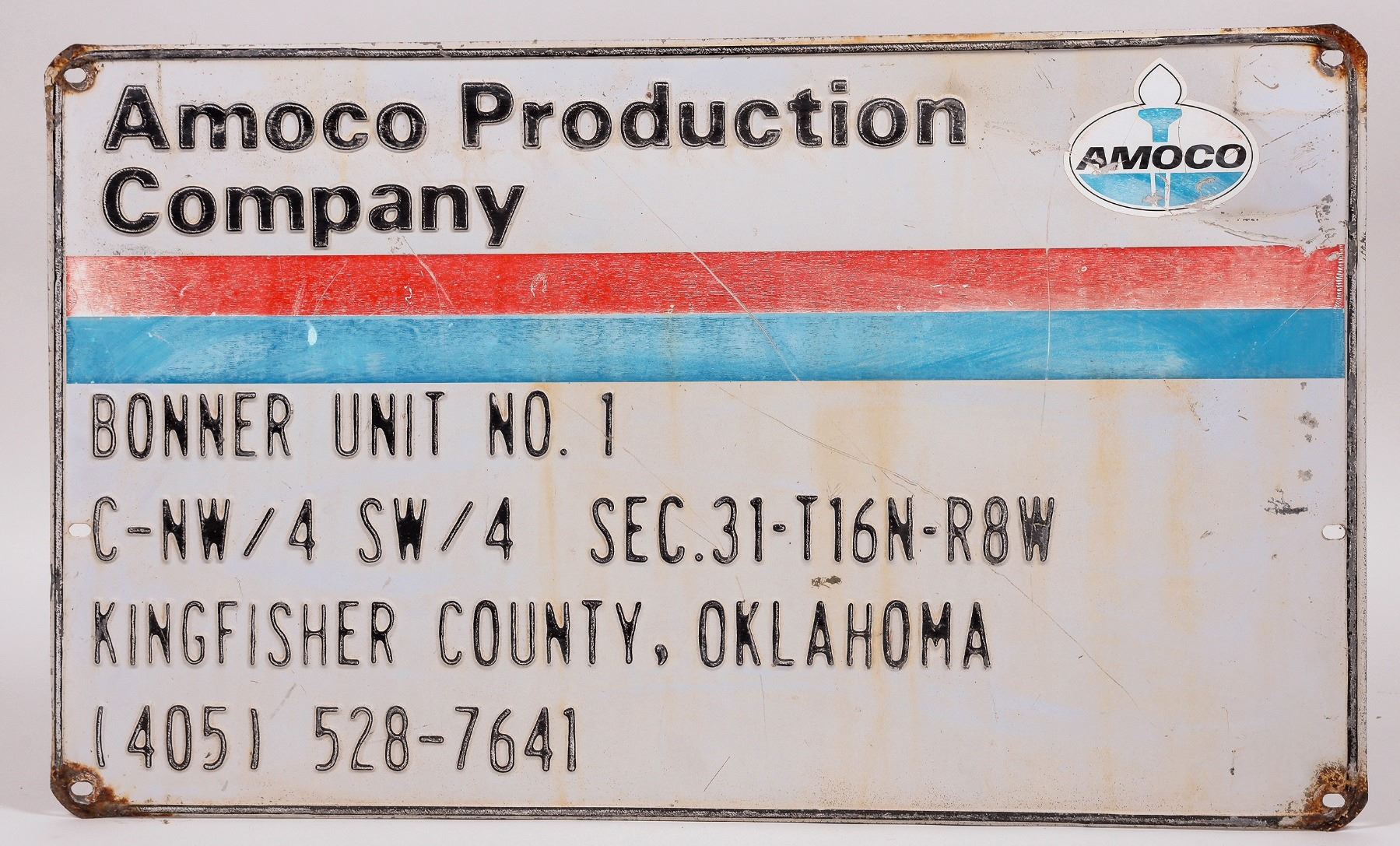 Kingfisher County, OK Amoco , Bonner Unit #1 metal sign. c. 1970's. 18x30". Some rust, fading and bends. Please inspect.
