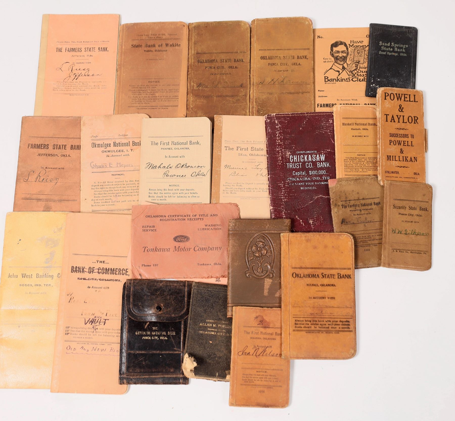 Lot of about 24 bank books from Oklahoma. Some are used and some are not. The used ones usually have the name of the bank account owner on the front. These are from banks in various towns including Ponca City, Oklahoma City, Stillwater, Jefferson, Wakita, Mulhall, Haskell, etc. Good condition, some are worn.