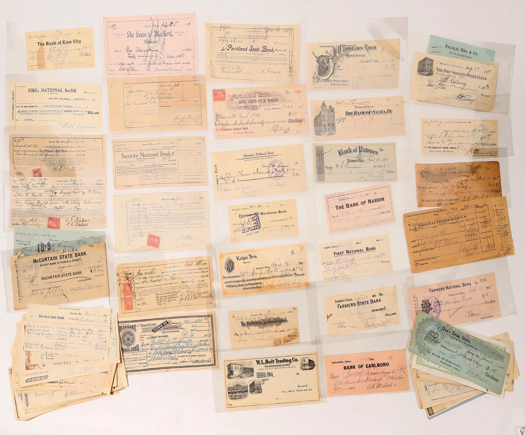 About 75 Oklahoma checks, c. 1989-1934. Sac and Fox Bank, Dr. TA Myers Dentist, Ash Flat Valley Bank, First National Bank, DH Stewart etc.