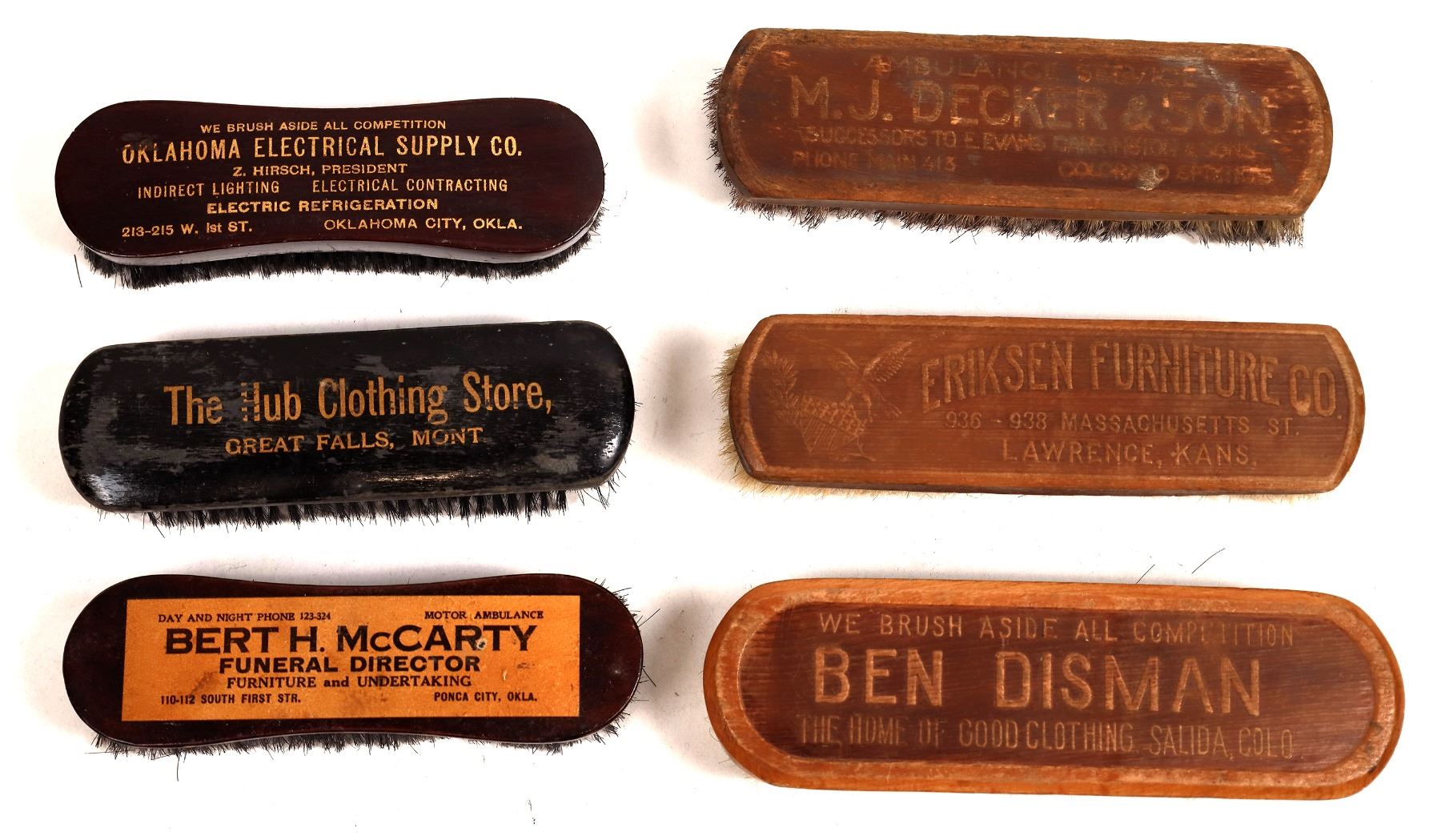 13 vintage wood mostly Oklahoma and Colorado shoe polishing brushes. Enid, Denver, Salida, Chickasha, Joplin, Wichita, Lawrence KS, Ponca City, Colorado Springs, Oklahoma City, Great Falls, MT.