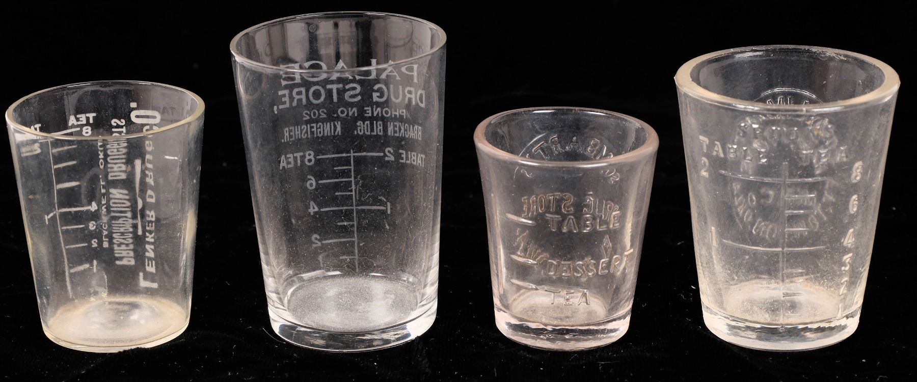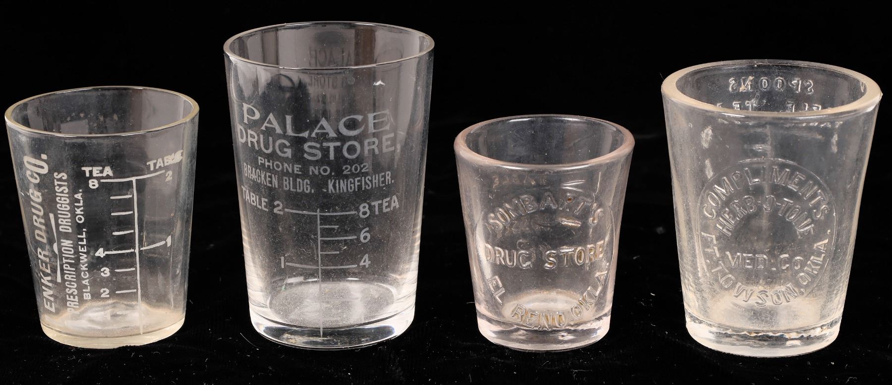 4 drug store dose glasses. Embossed-Herb-O-Tone, Fort Towsa, Okla. 2.25", small inner lip chip. Sombart's Drugstore, El Reno, Okla. 1.75" . Silk screened-Lenker Drug Company, Blackwell, Okla. 2". Palace Drug Store, Kingfisher. No other apparent chips or cracks.